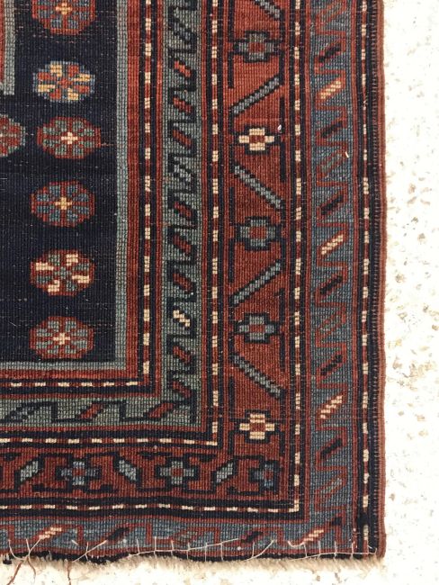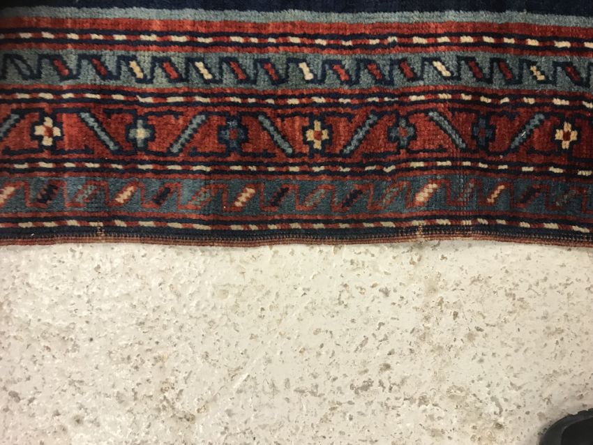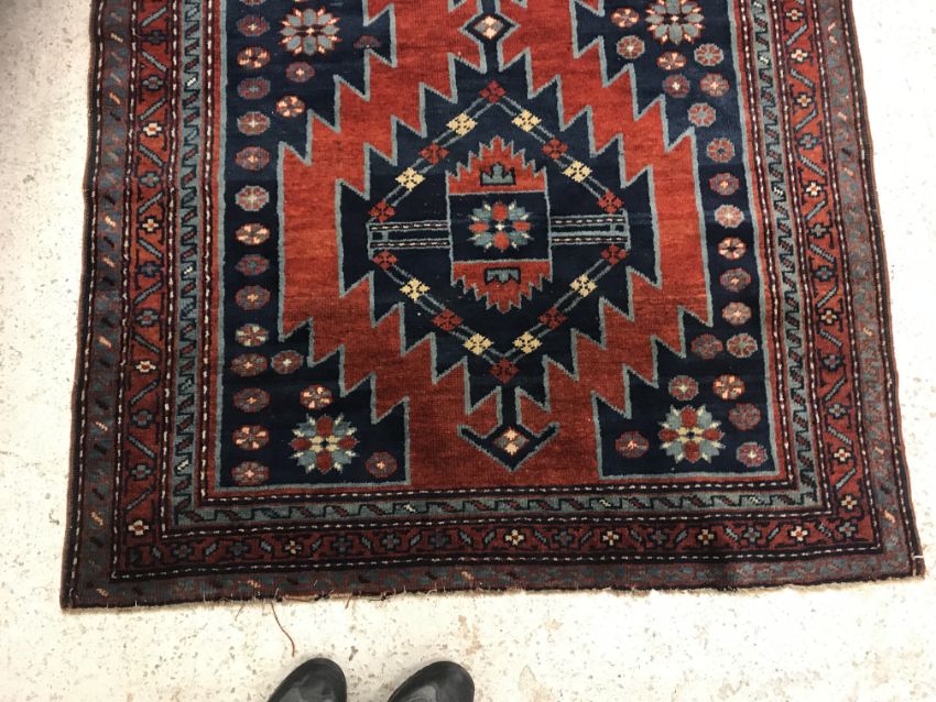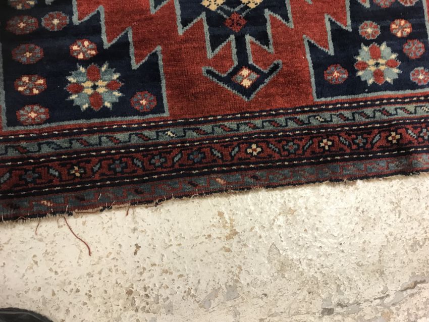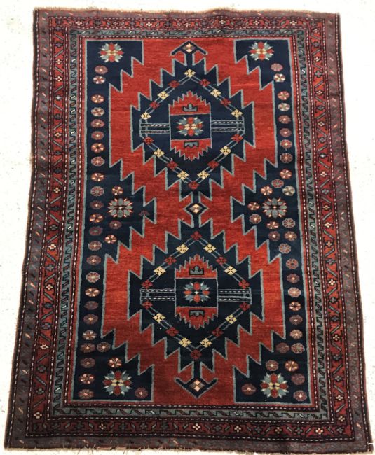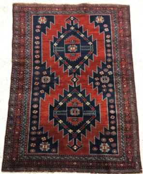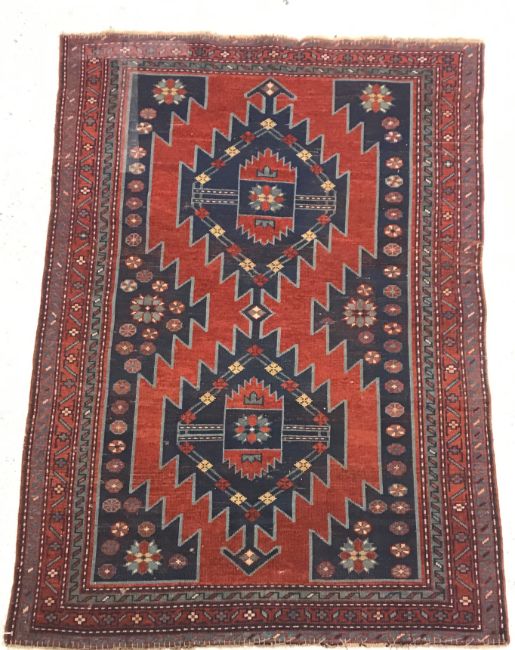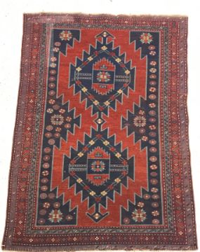 A Caucasian rug, the central panel set with two lozenge shaped medallions on a blue ground with stylised flowerhead decoration within a stepped blue, red and cream border approx. 156 cm x 109 cm