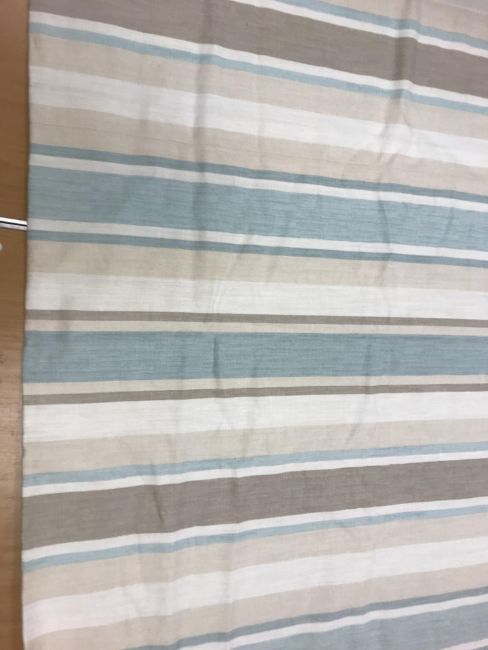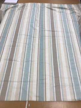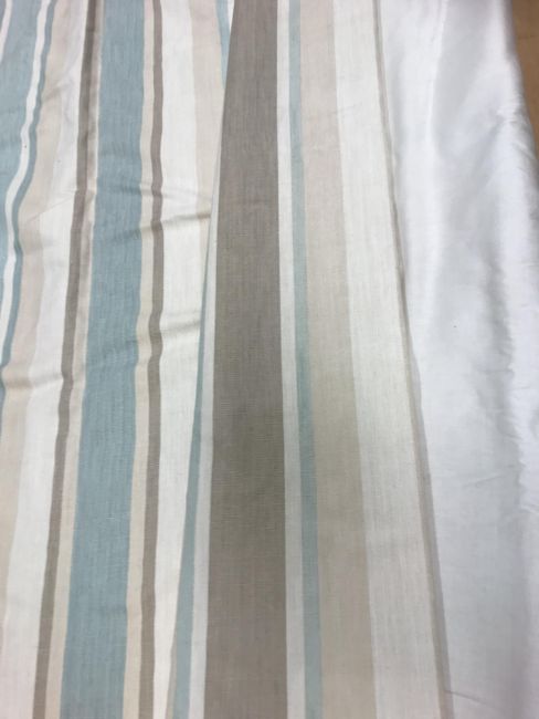 Two pairs of linen type cream, mushroom and aqua Laura Ashley striped interlined curtains with taped pencil pleat headings, approx 208 cm drop x 125 cm wide at bottom, a single matching curtain, approx 208 cm drop x 218 cm wide at bottom and a further single matching curtain, approx 208 cm drop x 170 cm wide at bottom, together with a pair of blue velvet curtains with taped pencil pleat headings, approx 124 cm drop x 166 cm wide at bottom, a pair of Crowsen Fabric "Sandringham" cotton satin lined curtains with taped pencil pleat headings, approx 212 cm drop x 233 cm wide at bottom and a pair of GP & J Baker "Canton" cotton lined curtains with fixed triple pencil pleat headings, one pair approx 207 cm drop x 317 cm wide at bottom and 139 cm wide at top, the other approx 139.5 cm drop x 258 cm wide at bottom and 113 cm wide at top