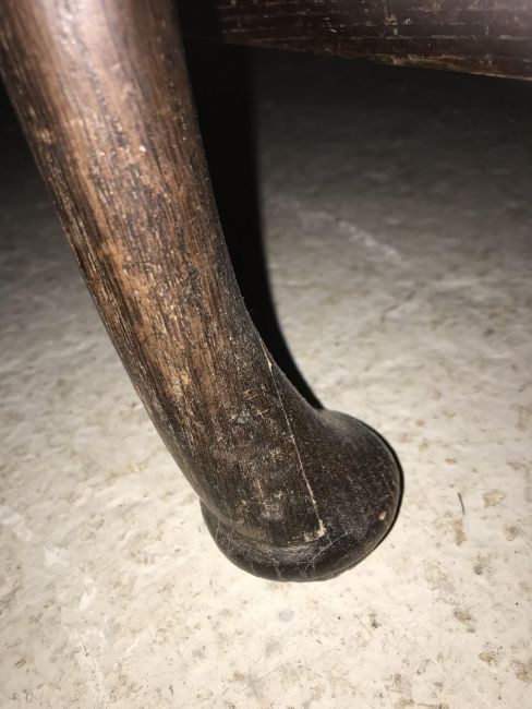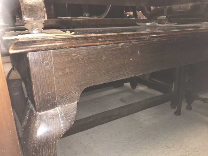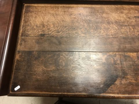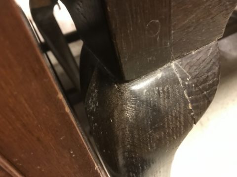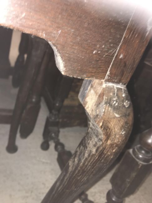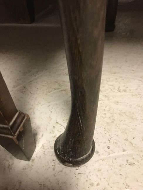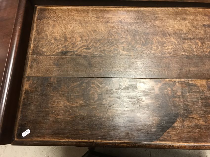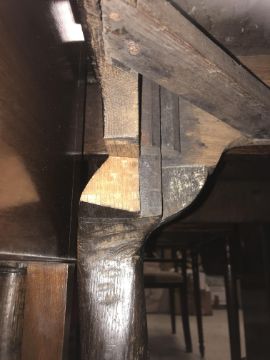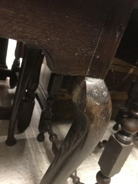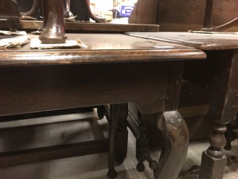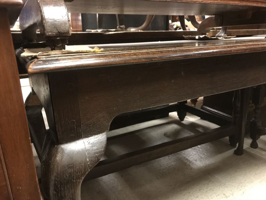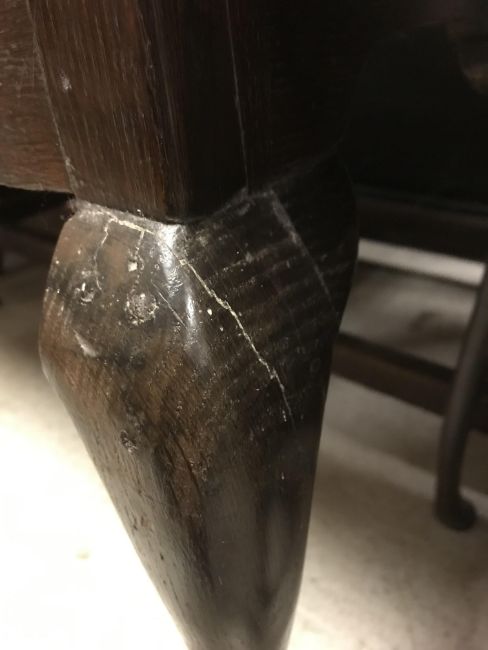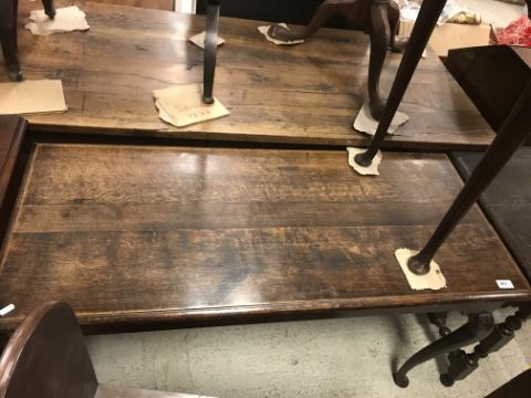 The top has two splits, one running along the entire plank length, the other approximately 40 cm in. Heavily marked burn/ink marks as well as scratches etc. Two blocks missing from the hips of the cabriole legs. All four feet feet - the wood is slightly gapping where it meets the leg. One leg - there is a crack to the cabriole hip. Surface scratches etc. Wear and tear conducive with age and use - see images for more details