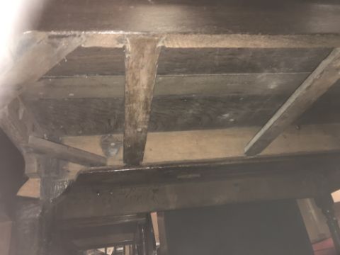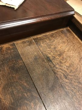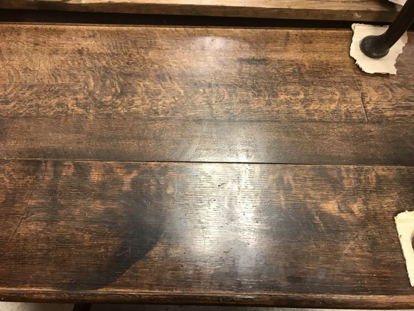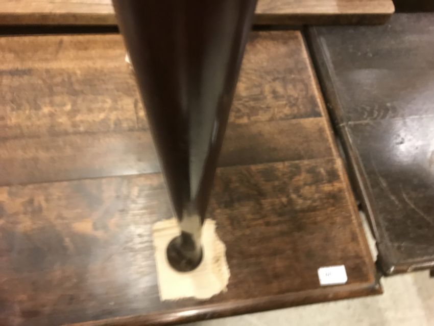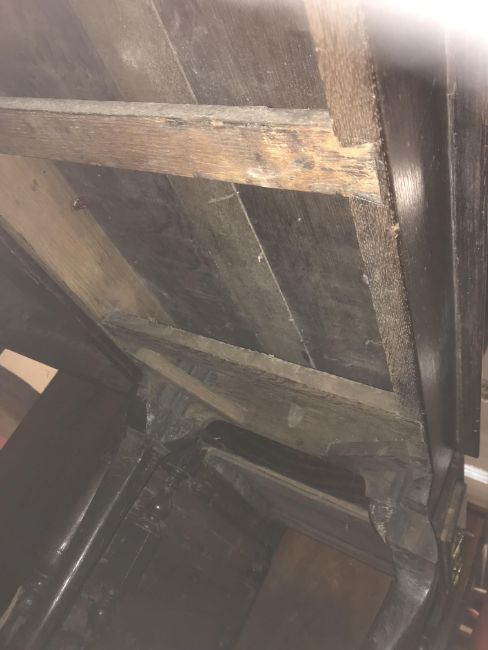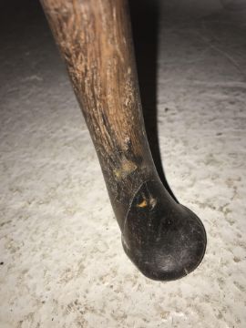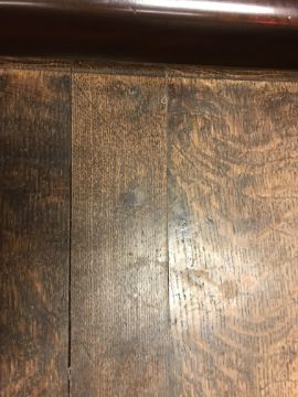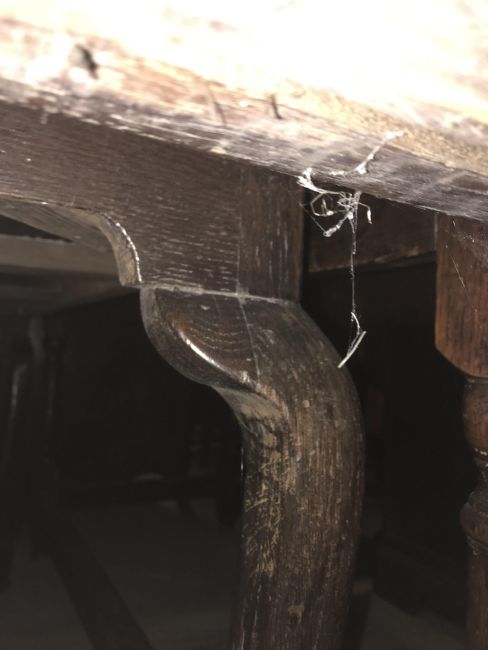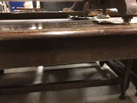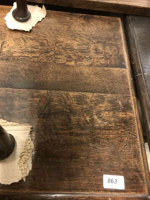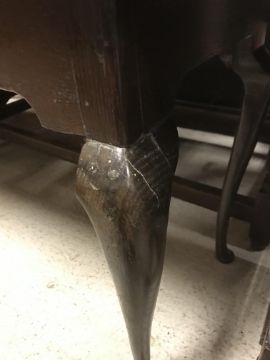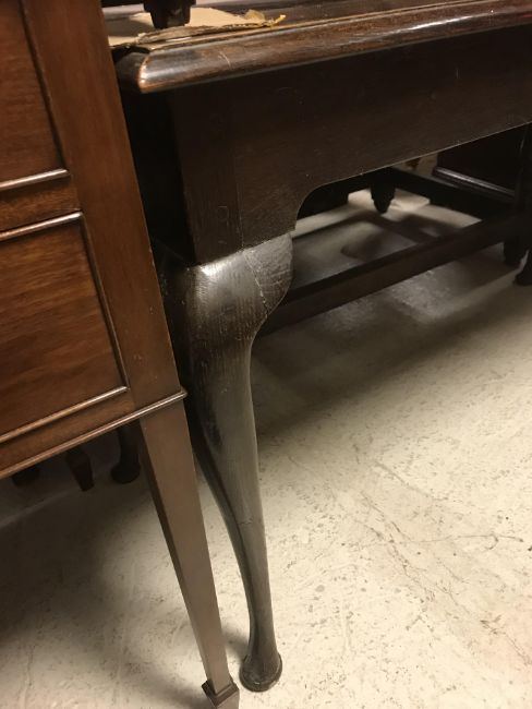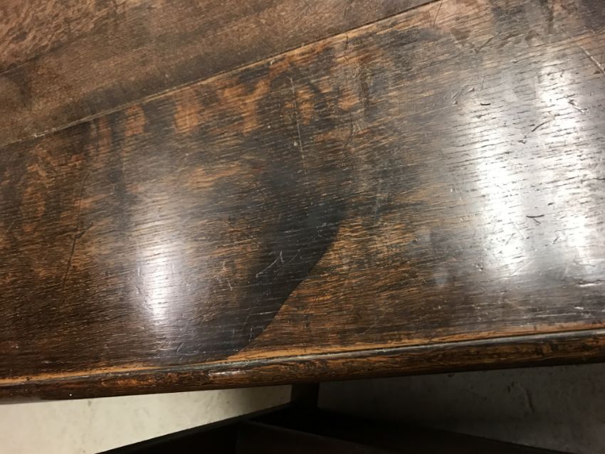 The top has two splits, one running along the entire plank length, the other approximately 40 cm in. Heavily marked burn/ink marks as well as scratches etc. Two blocks missing from the hips of the cabriole legs. All four feet feet - the wood is slightly gapping where it meets the leg. One leg - there is a crack to the cabriole hip. Surface scratches etc. Wear and tear conducive with age and use - see images for more details