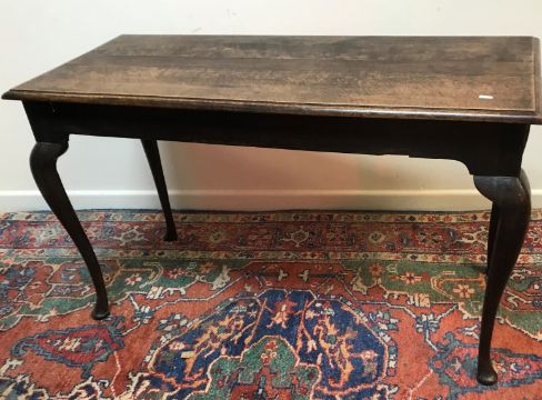 A 19th Century oak side table, the plank top with moulded edge above a plain frieze on cabriole legs to pad feet 120 cm x 51 cm x 72 cm high