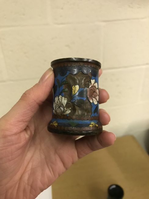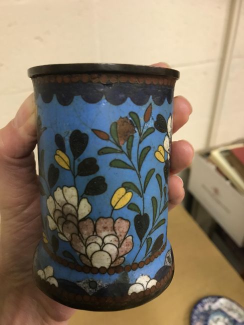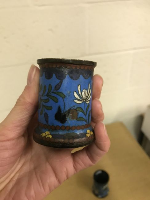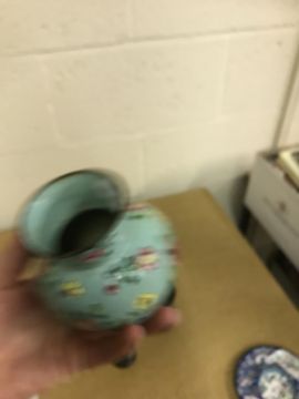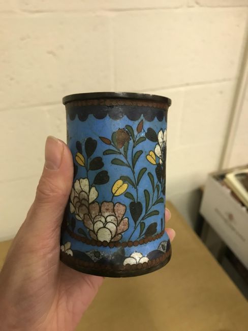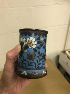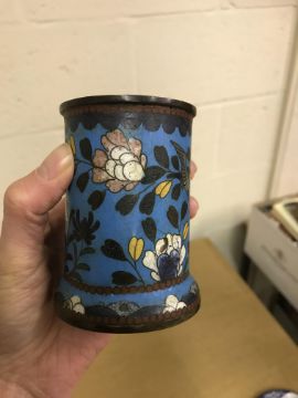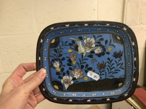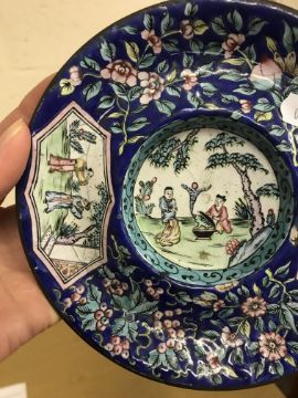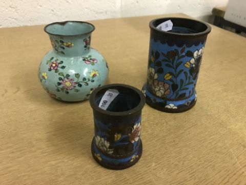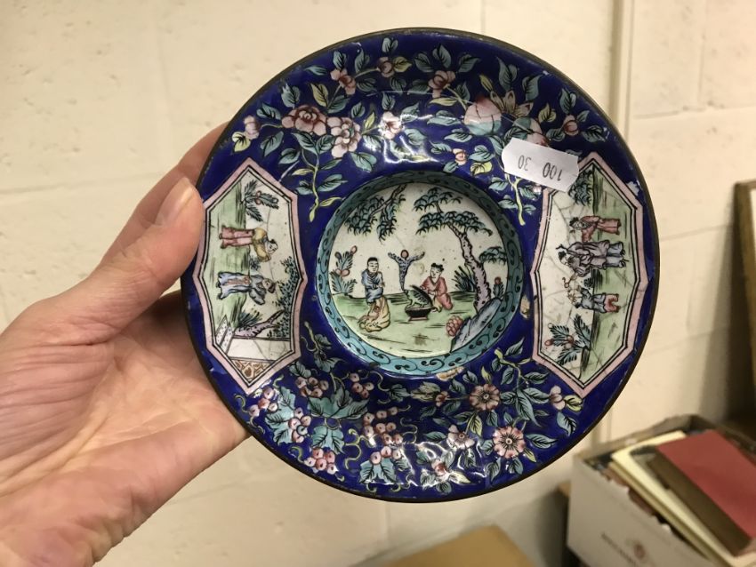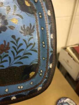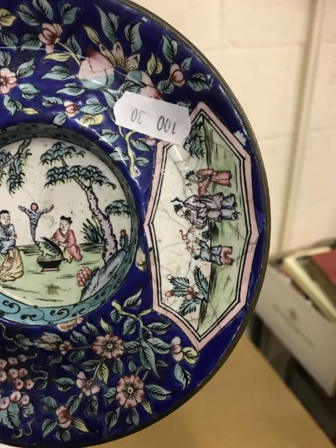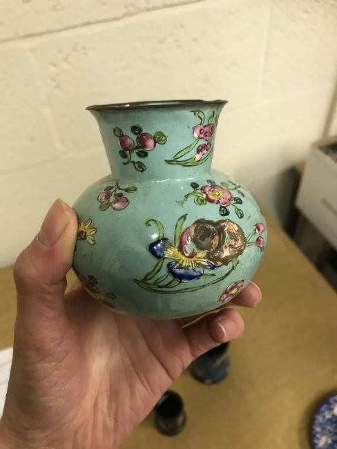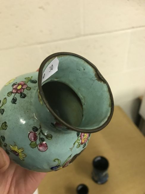 Shallow dish - sounds dull but no visbale cracks. Chips etc to the rim, scratches etc Tea Bowl chip to the foot Small pot chip to the rim All Cloisonne items have cracking, the 3 pots are all dented and areas of lose thorough out. All pieces have some small pin head loses, firing faults and general wear and tear condusive to age and use. See images for more details.