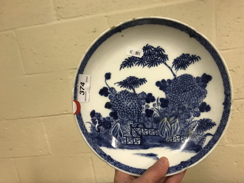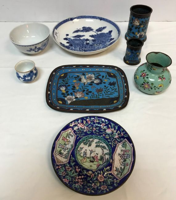 A Chinese porcelain shallow dish decorated with fence and garden pattern, 21 cm diameter, a Chinese blue and white tea bowl, 11.3 cm diameter, a small cauldron shaped pot, 4.5 cm diameter, three pieces of Chinese cloisonne ware including two cylindrical pots and a rectangular tray and an enamelled saucer with figure panel decoration and an enamelled floral spray famille-rose decorated pot