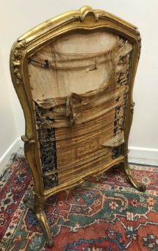A 19th Century carved giltwood framed adjustable fire screen formerly with silkwork panels, the panel rising upwards over a foliate and floral carved giltwood frame on moulded scroll supports, the panel with handwritten inscription "Viscount Melville, 3 Roland Way, South Kensington, London SW7" 70 cm wide x 108 cm high closed