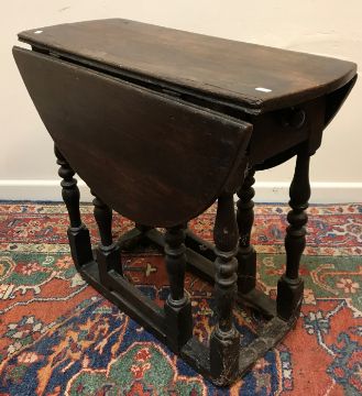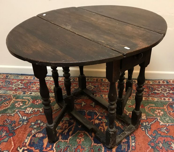 An 18th Century oak oval gate-leg tea table of small proportions, with single end drawer, raised on baluster turned and ringed supports, 89 cm wide x 74 cm deep x 67 cm high