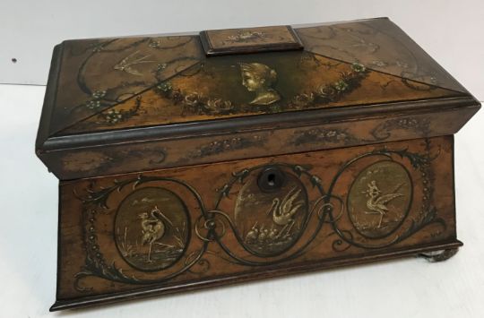 A 19th Century birds eye maple sarcophagus shaped tea caddy, the quartered lid painted with figural busts and swallows amongst scrolling floral drapes opening to reveal a similarly decorated interior and two rosewood and floral wreath decorated canisters with simulated rosewood painted sides flanking a bowl recess, the main body decorated with panels of storks and children flanked by ribbon tied floral drapes raised on ball feet (two replacements, one missing) 41 cm wide x 23.5 cm deep x 22 cm high
