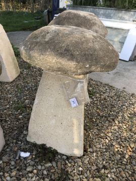 A stone topped staddle with weathered composite stone base