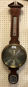 A modern mahogany cased banjo barometer thermometer by Comitti of Holborn with alcohol thermometer above a circular silvered dial and further dial for hygrometer 76 cm high