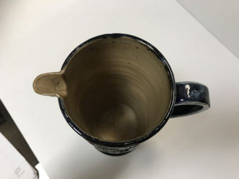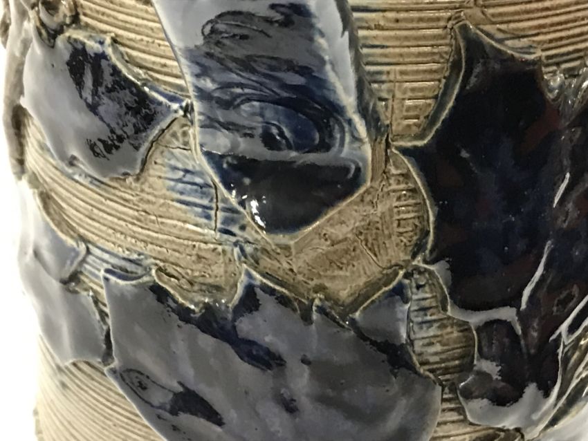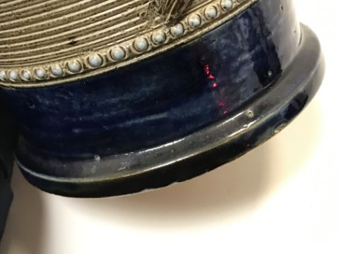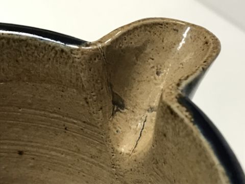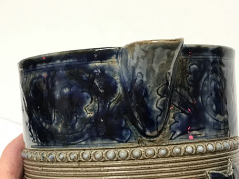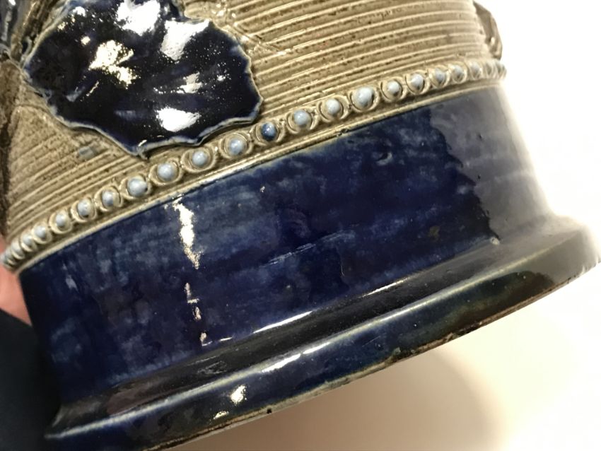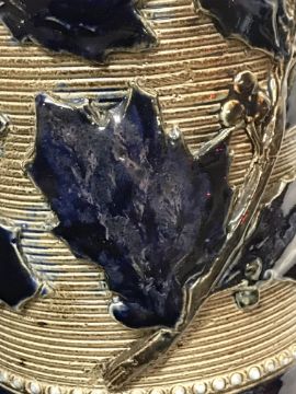 Various firing faults, cracks throughout including to the spout and handle area. Otherwise pinhead holes to the glaze. A bit of discolouration to a couple of the holly leaves (slightly more purpley in hue). Otherwise general wear and tear conducive with age and use to include some light surface scratching, minor losses etc - see images for more details.