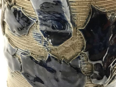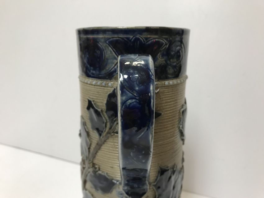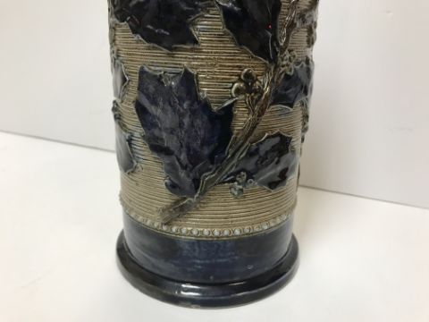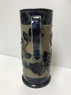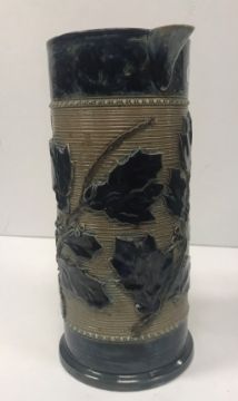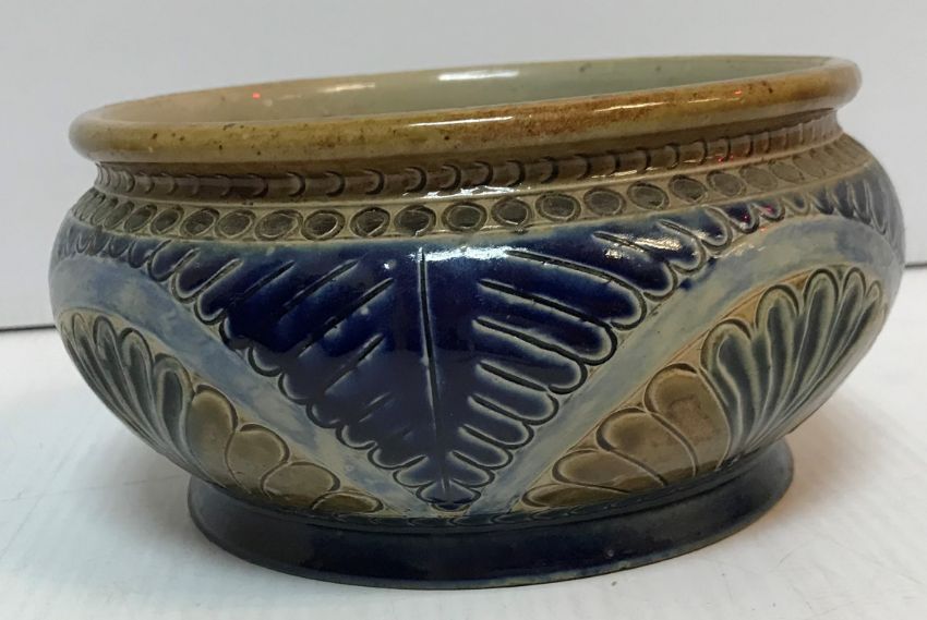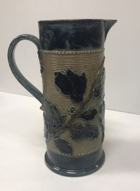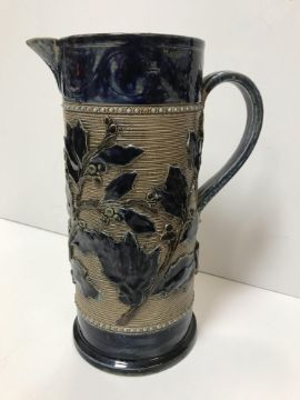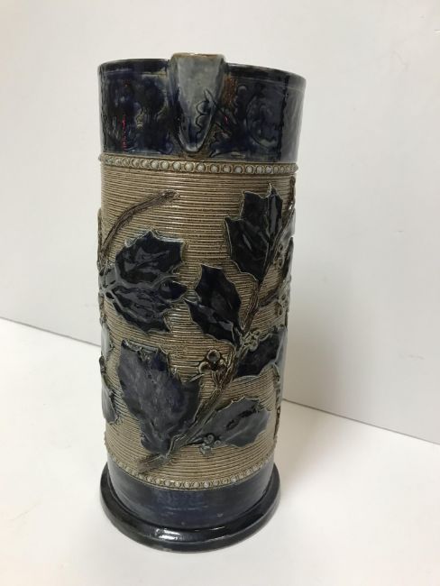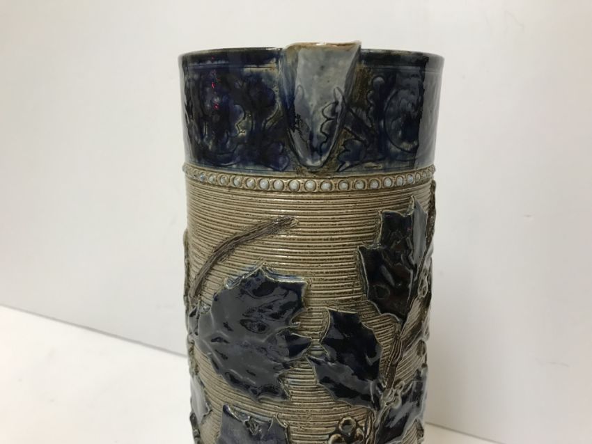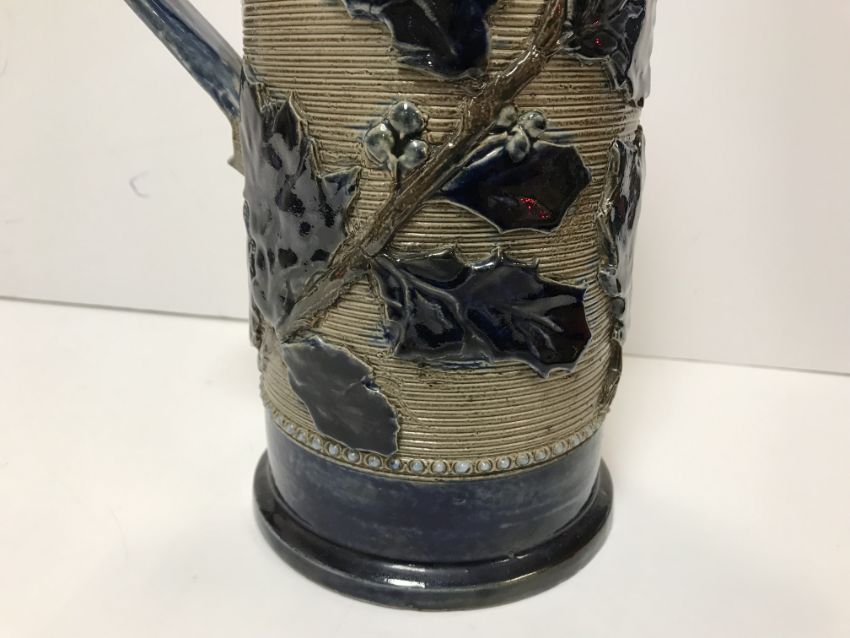 A Victorian glazed stoneware jug with holly decoration, unmarked but in the style of Martin Brothers 26 cm high together with a CJC Bailey Fulham bowl of low form with incised stylised foliate decoration in blue, mustard and green signed "Bailey Fulham" and initialled to base 9 cm high x 19.5 cm in diameter