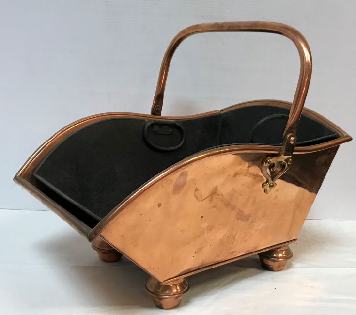 A Victorian copper coal scuttle with swing handle by Henry Loveridge of Wolverhampton circa 1886, No'd "37", raised on turned cup and cover feet with tin liner, 45 cm long