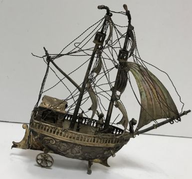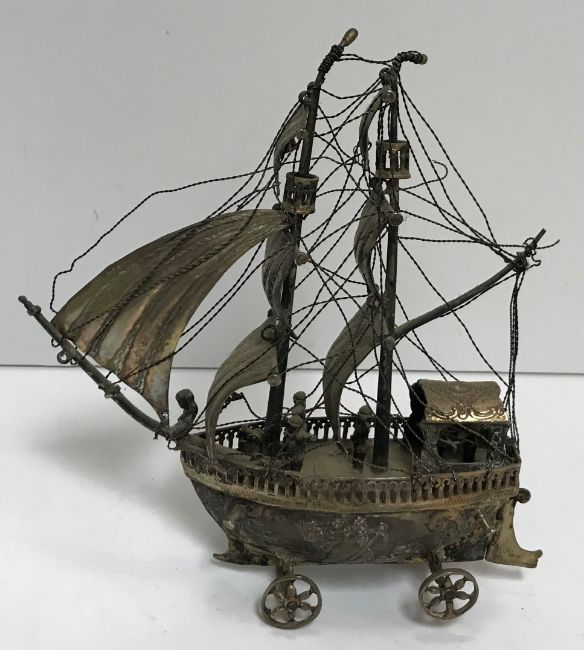 An early 20th Century German silver model nef, the hull embossed with mythical figures and sea creatures, with movable rudder, the deck with pierced gallery and mounted with sailors and rigging (by Berthold Muller, bears import marks for London 1913 and German marks for Neresheimer of Hanover), approx 16 cm high, 6.5 oz