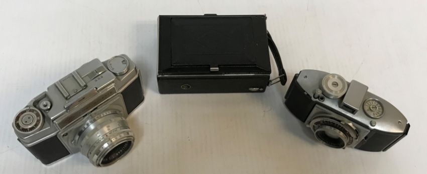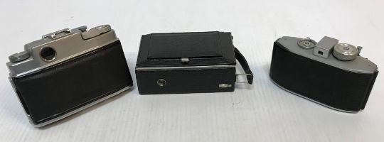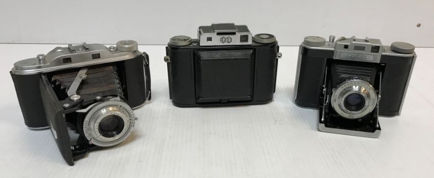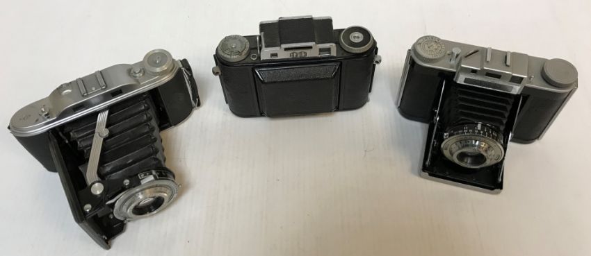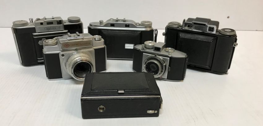 A collection of six various vintage Agfa cameras including an Ambi Silette, an Agfa Karat, an Agilux Agifold, another Agifold, an Agfa Record III and an Agfa standard bellows camera