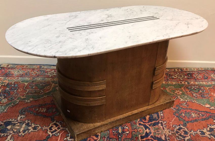 An Art Deco centre table, the elongated oval grey veined white marble top with central triple line inlaid decoration raised on a light oak pedestal support with moulded decoration 136 cm long x 70 cm wide x 66 cm high