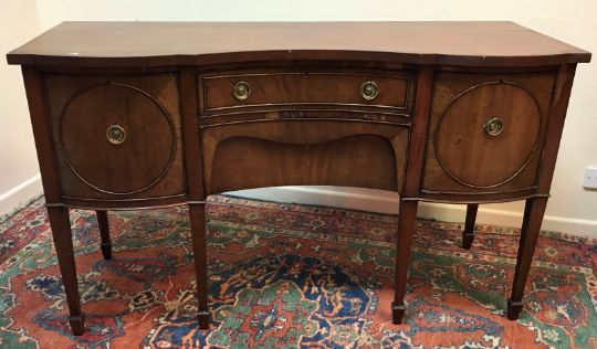 A 19th Century mahogany fire screen, the fabric centre panel raised on square tapered splayed supports to brass castors, 61 cm wide x 134 cm high, together with a circa 1900 mahogany breakfront sideboard, the plain top over two recessed centre drawers and deep drawer and cupboard door, raised on square tapered legs to spade feet, 153 cm wide x 61 cm deep x 89.5 cm high