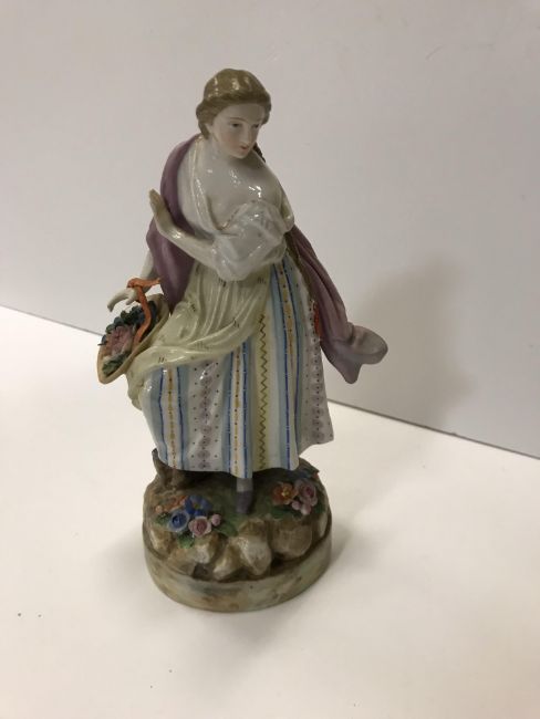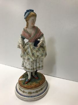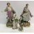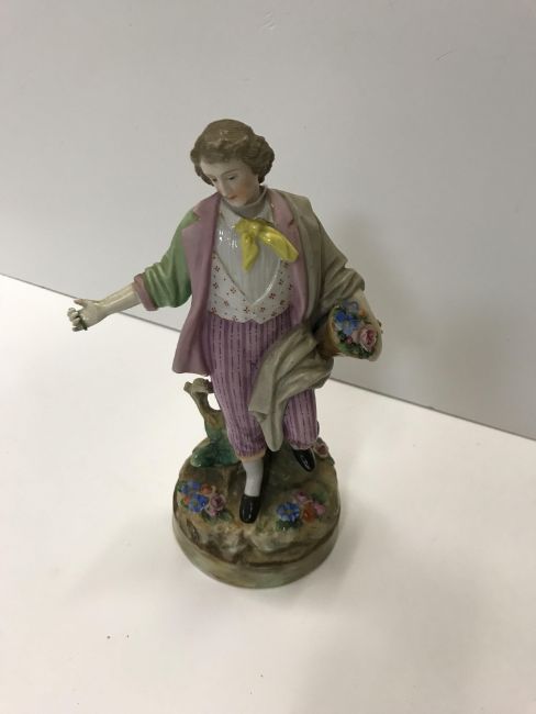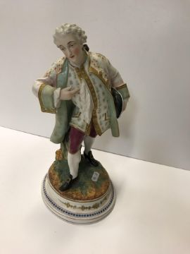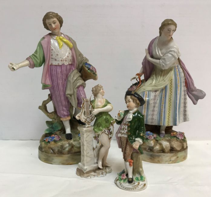 A pair of Continental coloured bisque porcelain figures of a lady and gentleman in 18th Century dress 33 cm high and another smaller pair of glazed porcelain figures of a lady and gentleman with baskets of flowers 20.3 cm high