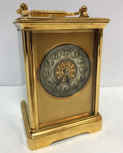 A circa 1900 French lacquer brass cased carriage clock, the silvered circular dial with Arabic numerals within medallions enclosing a filigree work gilt metal centre medallion raised on bracket feet 14 cm high