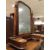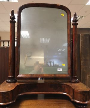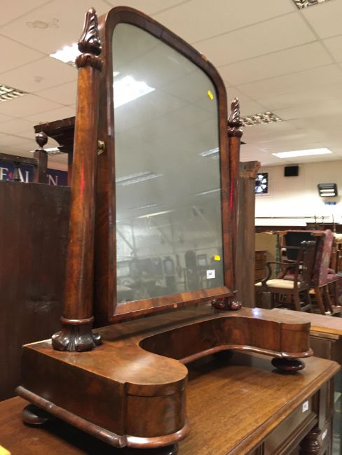 A Victorian figured mahogany toilet mirror, the dome plate on foliate capped tapering column supports to the platform base, with two D shaped drawers, one at each end, raised on squat bun feet, 68 cm wide x 82 cm high