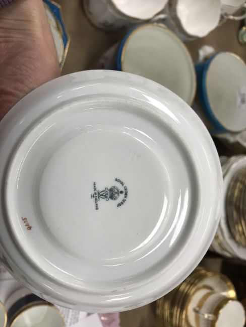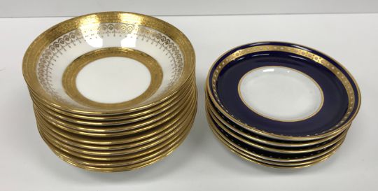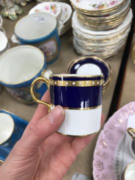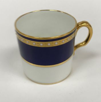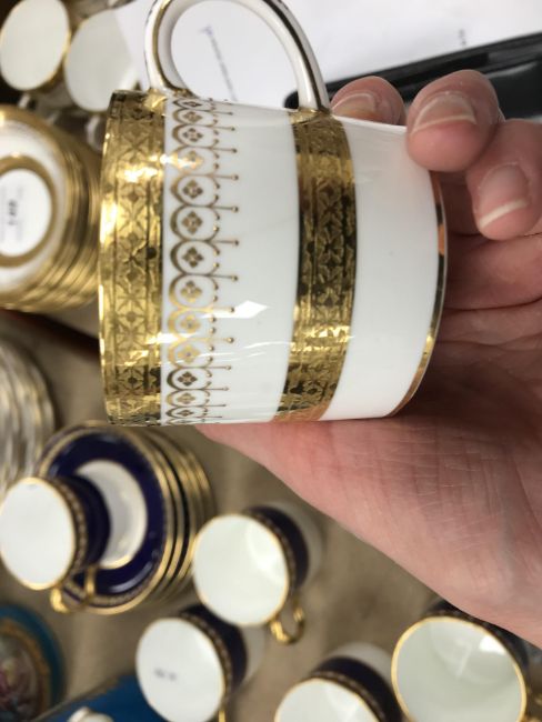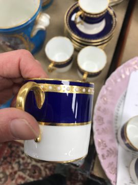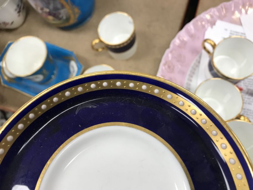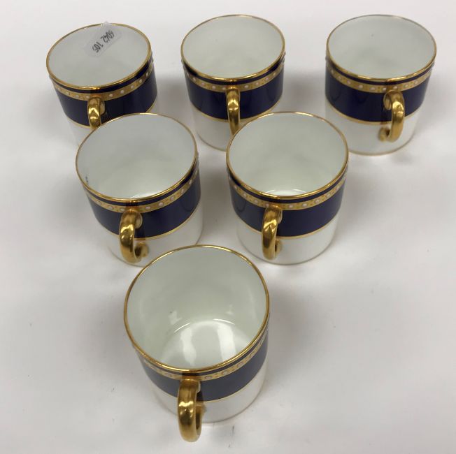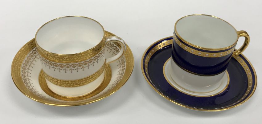 A Royal Crown Derby royal blue gilt and jewelled banded set of six coffee cans and saucers together with a Mintons gilt decorated set of seven coffee cans and twelve saucers