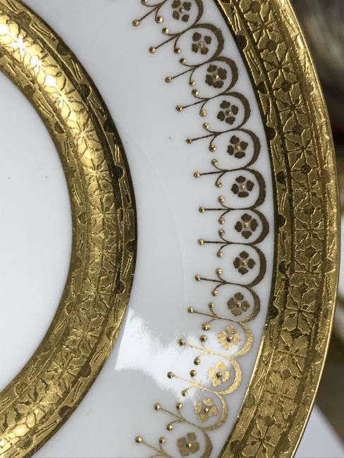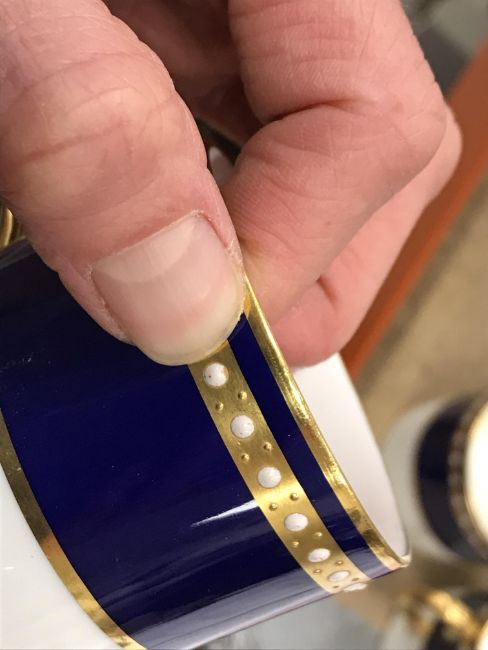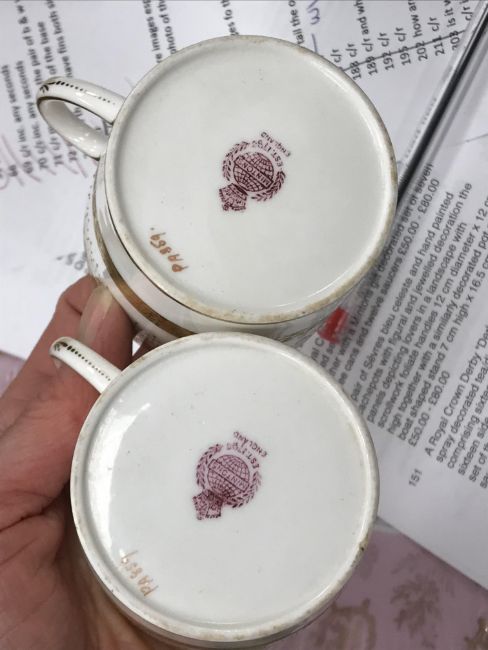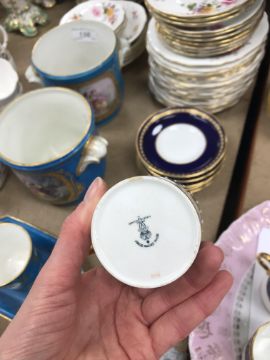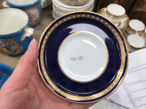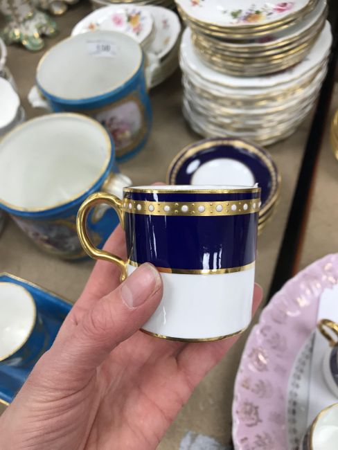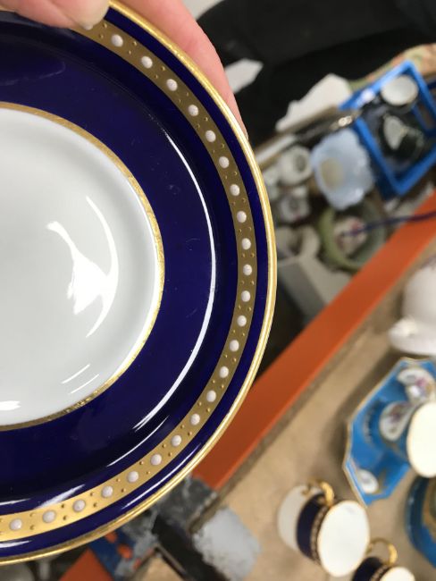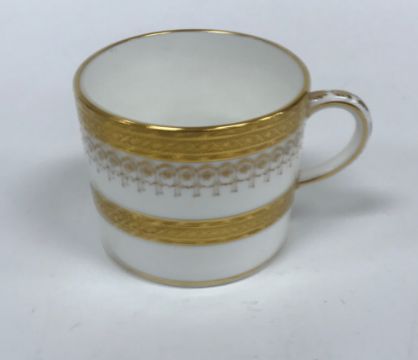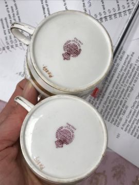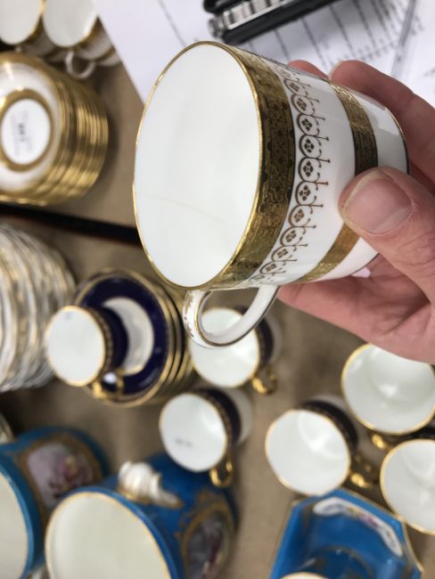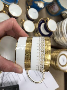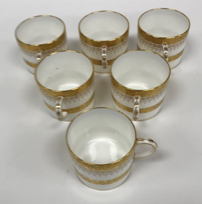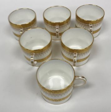 One coffee can - one jewel is half missing, otherwise some light surface scratching, general wear and tear to coffee cans and saucers and in need of a good clean. The Mintons coffee cans - all have general wear and tear, one cup has a large hairline crack running down it. Two of the saucers have hairline fractures although one rings true. All items have general wear and tear conducive with age and use to include some light surface scratching etc and are in need of a clean - see images for examples