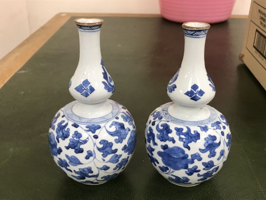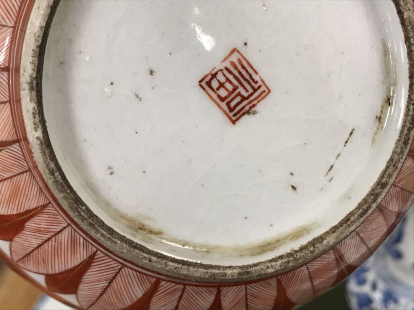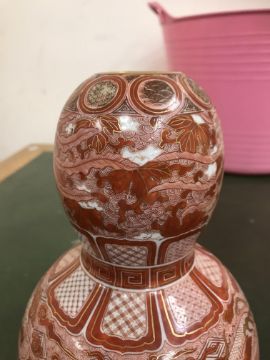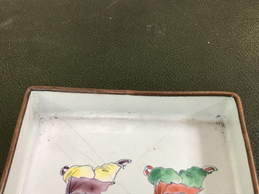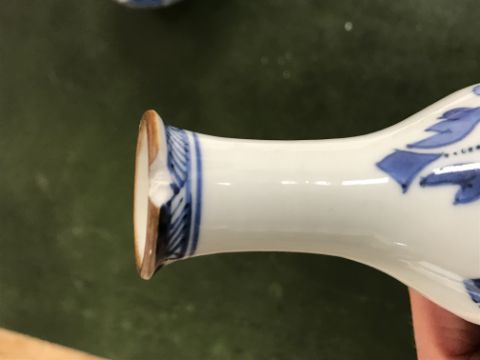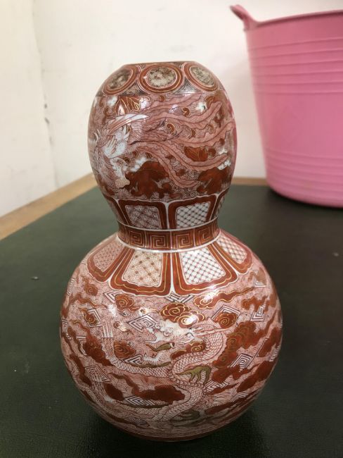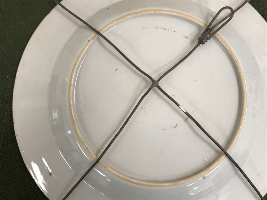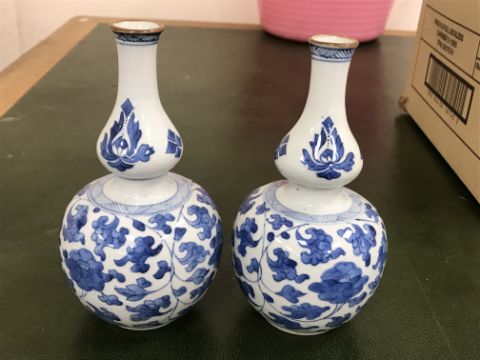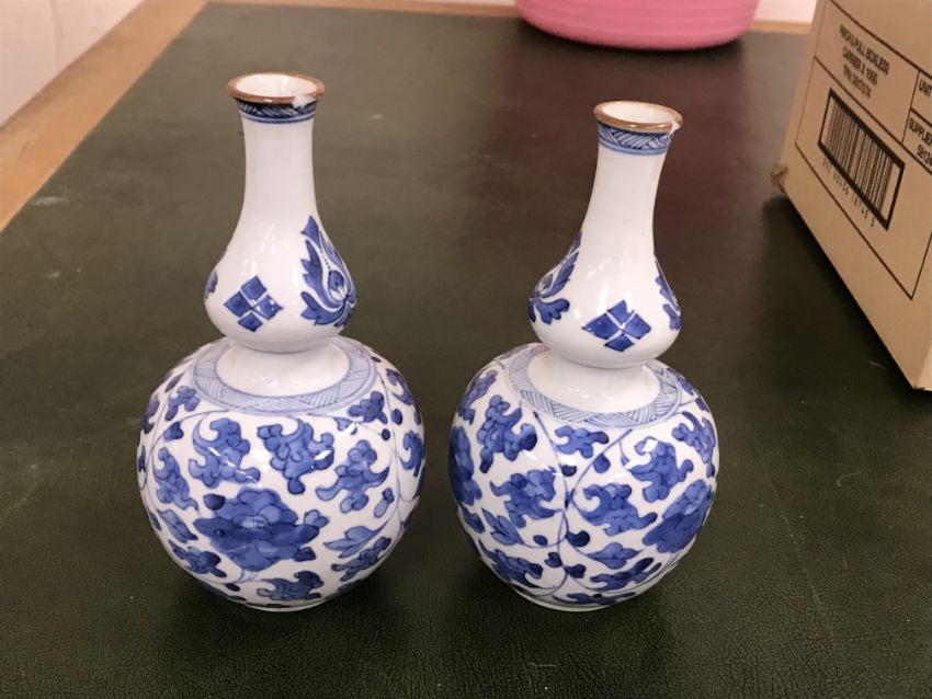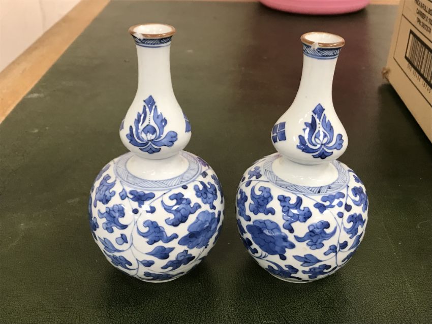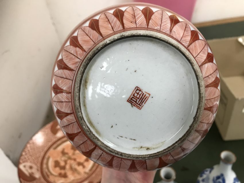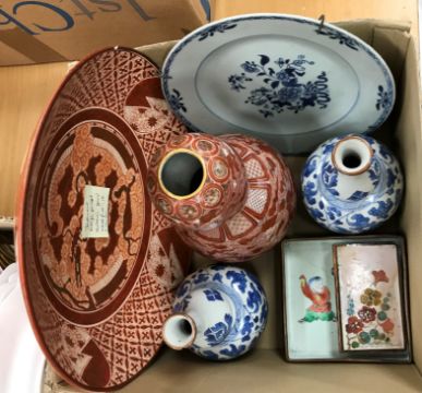 Gourd shaped vase has not been ground down, glazed inside throughout and the gilt appears to be original. All over crazing. The charger has a chip to the outer rim, all over crazing, some discolouration. Blue and white plate has chipping throughout to the edge. Pair of blue and white vases - both have chips to the rims and hairline fractures running from them. One has a chip to the glaze on the main body. Otherwise all have general wear and tear to include firing faults etc conducive with age and use. The three enamelled pieces - all have damage, the pair of square dishes - significant damage throughout and the match striker cover has losses to the enamel in various places and some colour striations to one side. All items have general wear and tear conducive with age and use - see images for more details