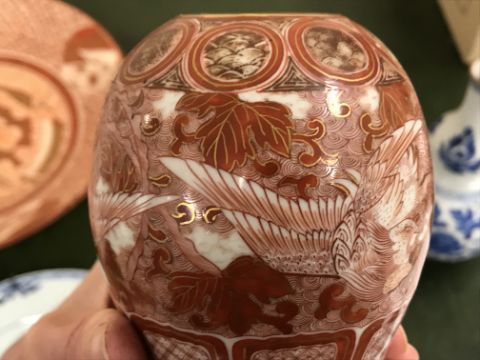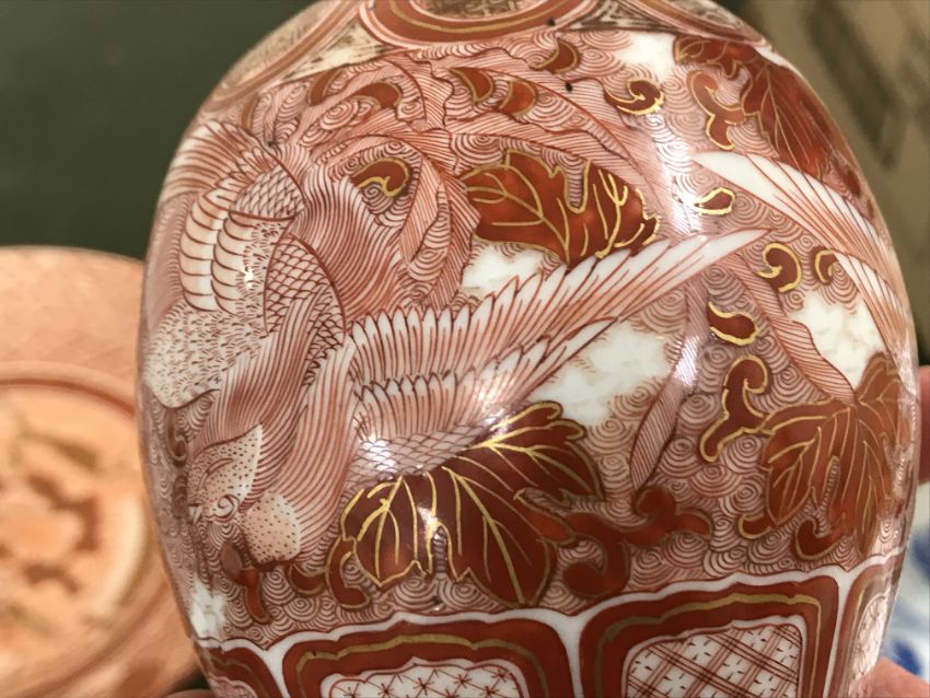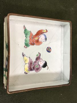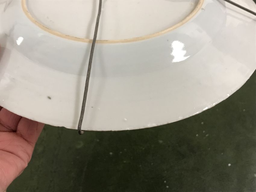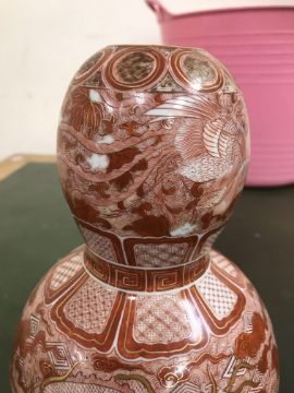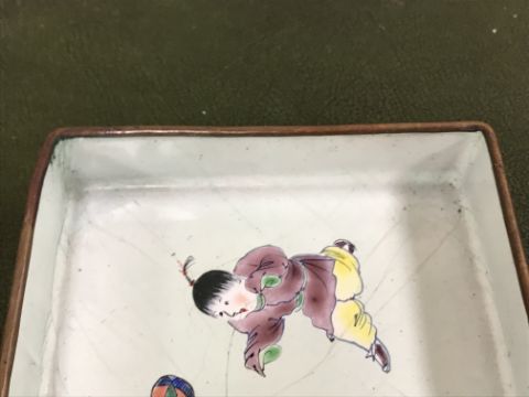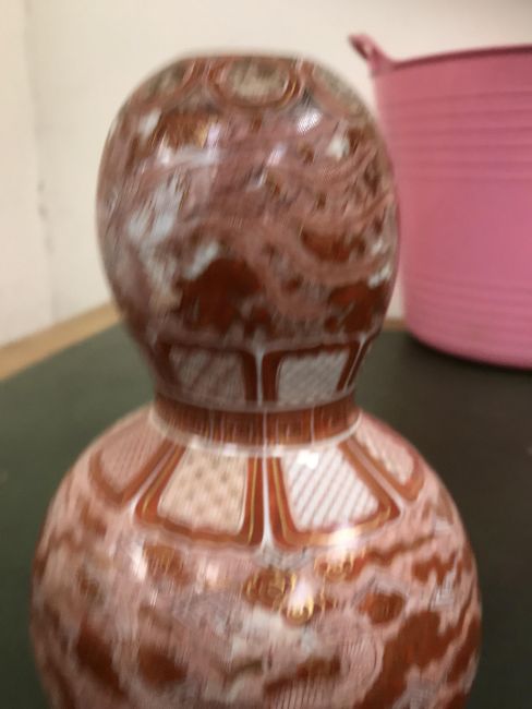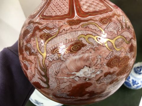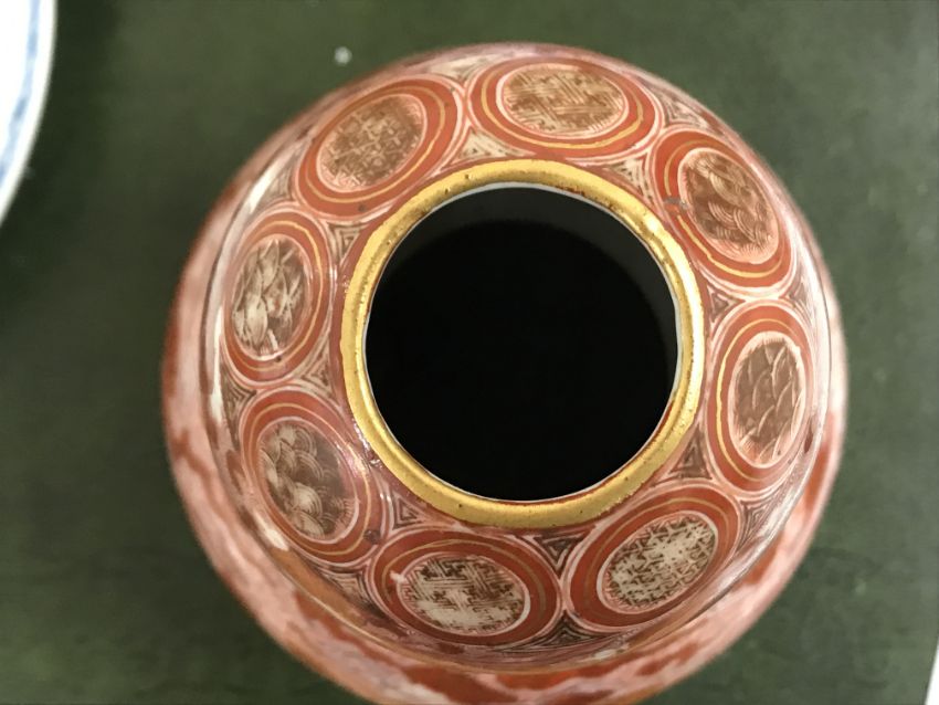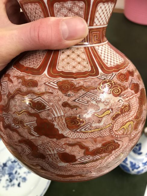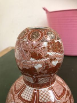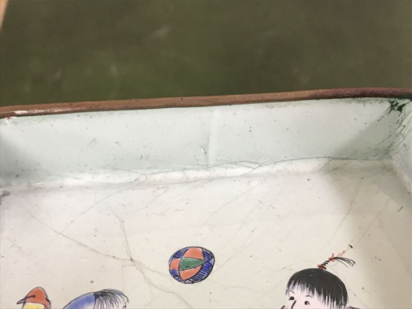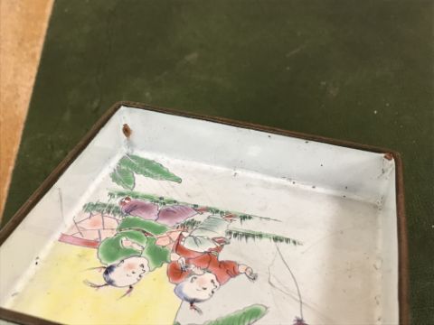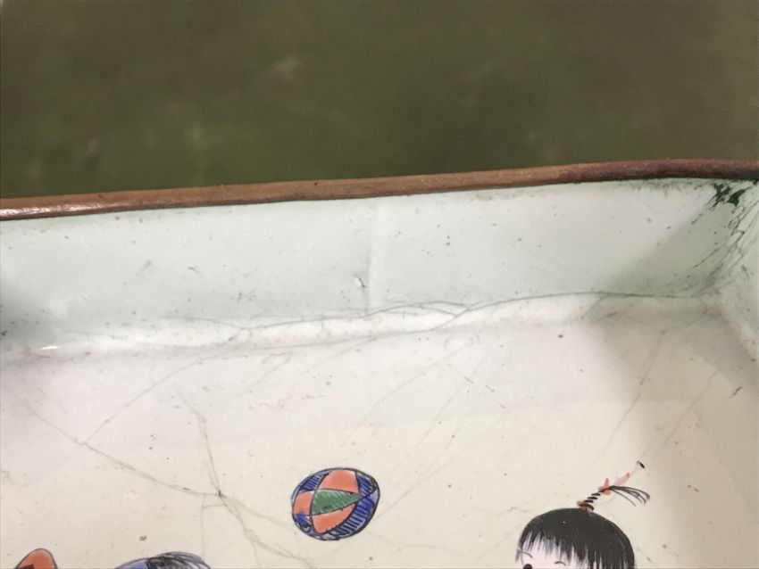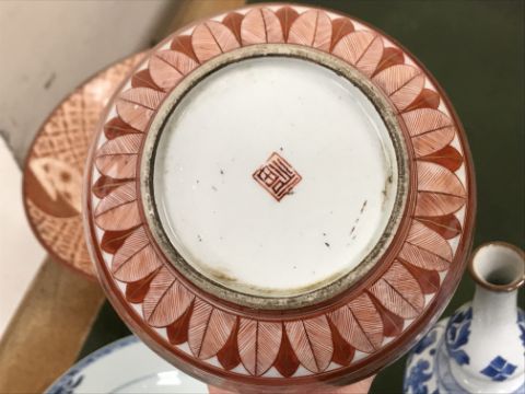 Gourd shaped vase has not been ground down, glazed inside throughout and the gilt appears to be original. All over crazing. The charger has a chip to the outer rim, all over crazing, some discolouration. Blue and white plate has chipping throughout to the edge. Pair of blue and white vases - both have chips to the rims and hairline fractures running from them. One has a chip to the glaze on the main body. Otherwise all have general wear and tear to include firing faults etc conducive with age and use. The three enamelled pieces - all have damage, the pair of square dishes - significant damage throughout and the match striker cover has losses to the enamel in various places and some colour striations to one side. All items have general wear and tear conducive with age and use - see images for more details