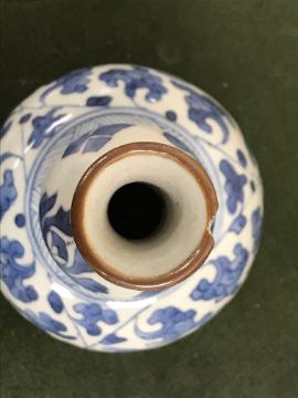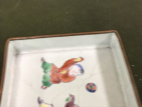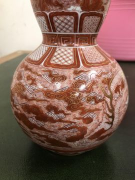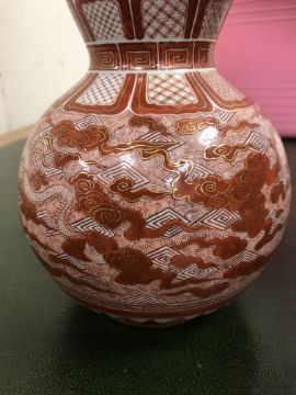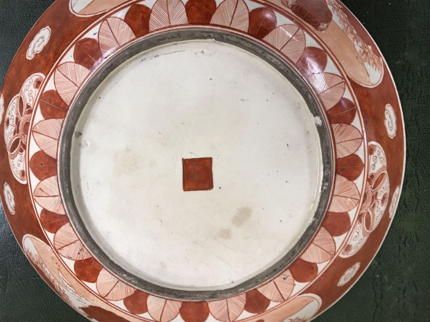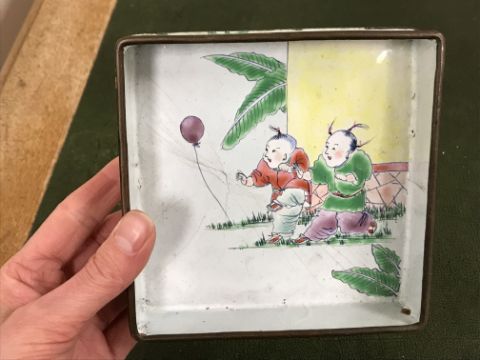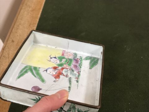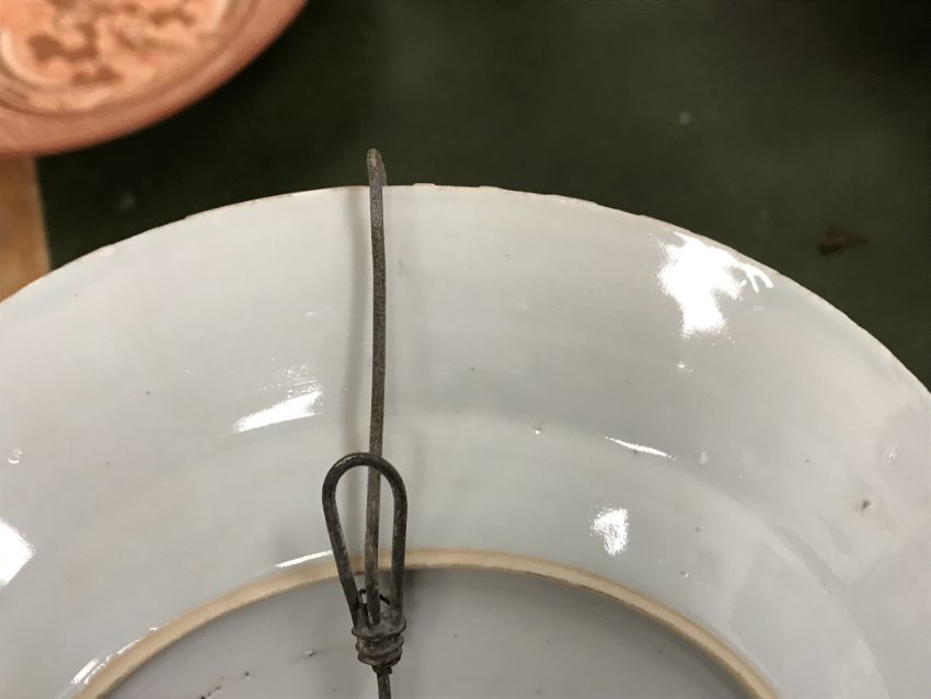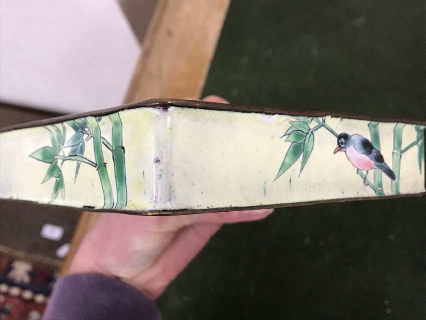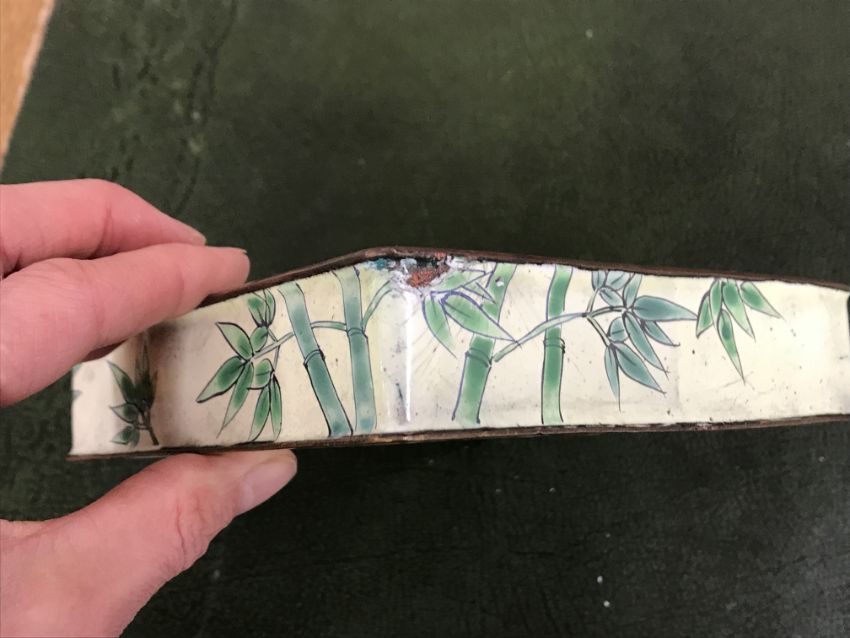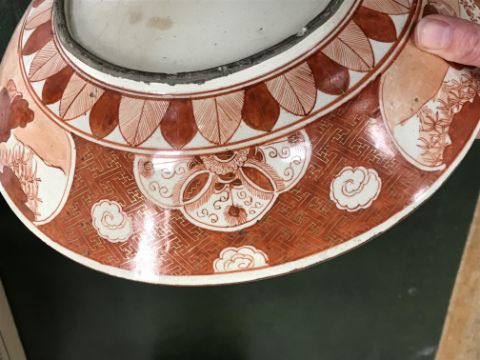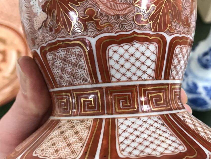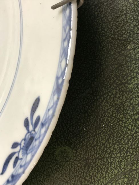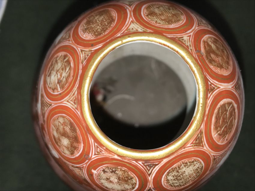 Gourd shaped vase has not been ground down, glazed inside throughout and the gilt appears to be original. All over crazing. The charger has a chip to the outer rim, all over crazing, some discolouration. Blue and white plate has chipping throughout to the edge. Pair of blue and white vases - both have chips to the rims and hairline fractures running from them. One has a chip to the glaze on the main body. Otherwise all have general wear and tear to include firing faults etc conducive with age and use. The three enamelled pieces - all have damage, the pair of square dishes - significant damage throughout and the match striker cover has losses to the enamel in various places and some colour striations to one side. All items have general wear and tear conducive with age and use - see images for more details