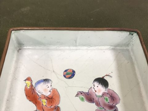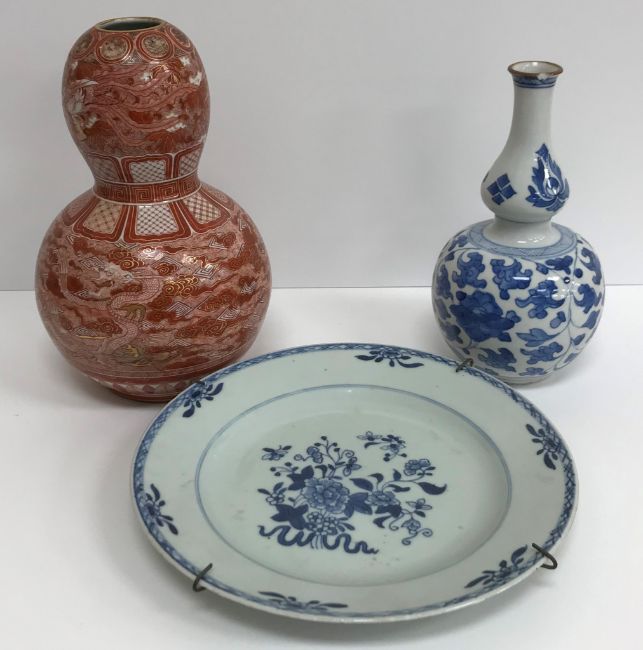 A Japanese Meiji period kutani gourd-shaped vase, 23 cm high, a similar deep charger, 31 cm diameter, pair of Chinese gourd-shaped blue and white foliate decorated vases with concentric ring marks to base, a Chinese floral spray decorated blue and white plate, two Chinese enamel decorated square dishes, decorated with children playing with a ball and balloon and an enamel decorated copper matchbox holder