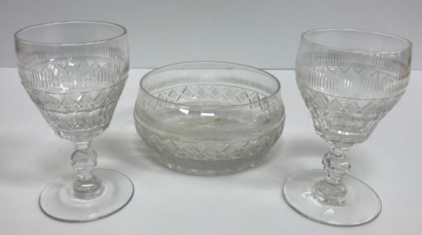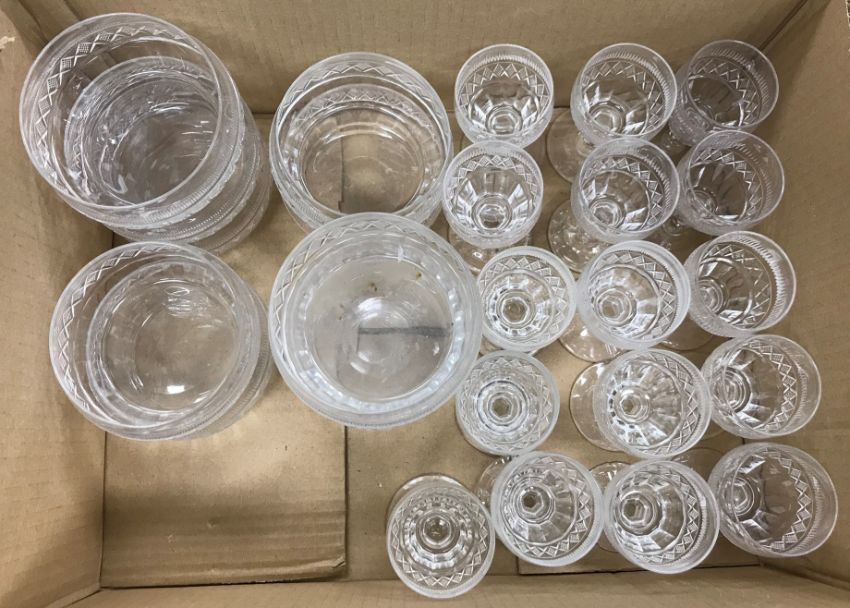 A set of sixteen lozenge and facet cut stemmed drinking glasses and ten matching rinsers