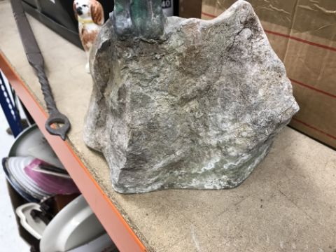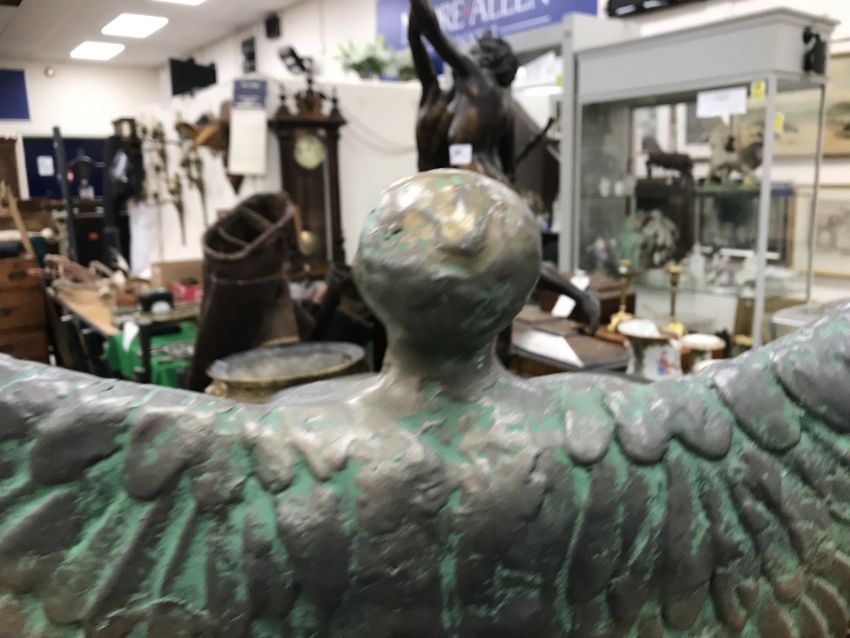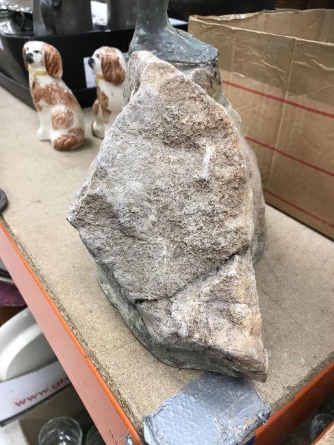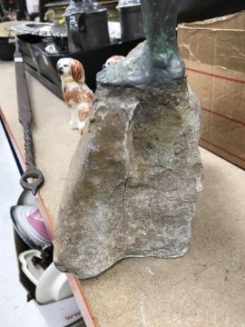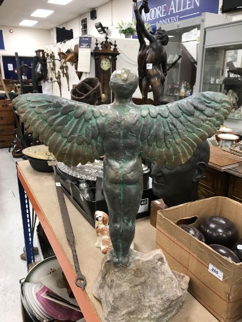 A Louise Vergette bronzed and verdigris statue of Icarus on a rock 56 cm high x 44.5 cm wide, together with a Manchester United commemorative scarf 1902-2002 and a mid 20th Century stamp album containing various world stamps
