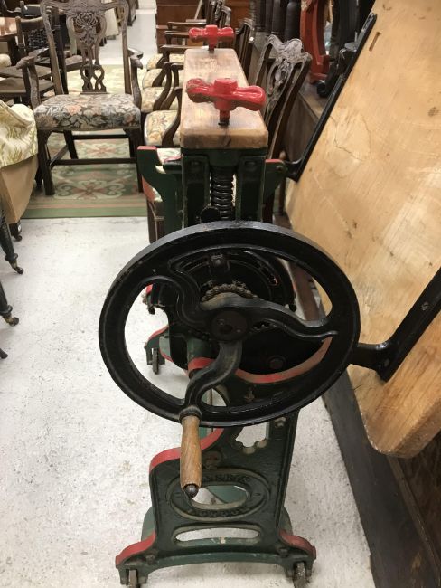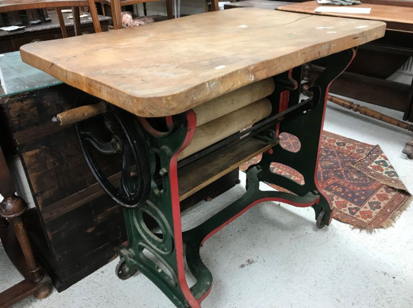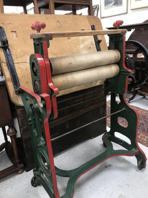A circa 1900 cast iron framed mangle by Harris of London, the metal work green and red painted with oak panel top 91.5 cm x 59 cm x 84.5 cm high