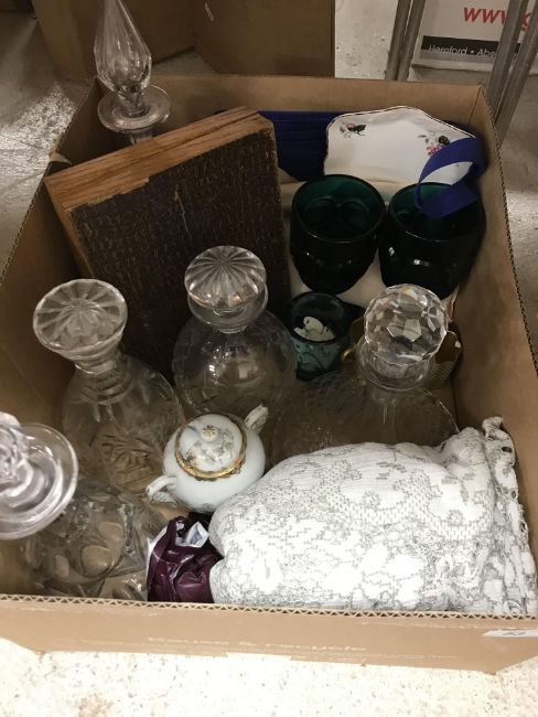 A box containing five various cut glass decanters, three Royal Adderley bottle labels inscribed "Gin", "Brandy" and "Vermouth", a pair of green glass drinking glasses etc