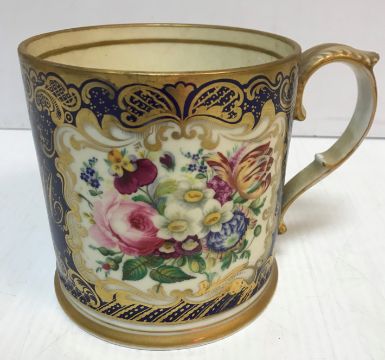 A 19th Century oversized mug, royal blue and gilt decorated set with floral painted panels of flowers and initials "DCM" 13 cm high x 12.5 m diameter