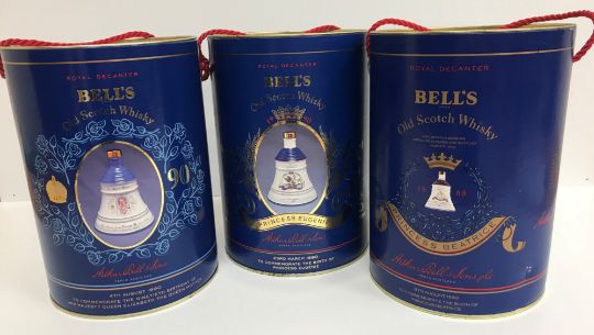 Three Bells Old Scotch Whisky Royal Decanters, in original cylinder cases including "Princess Beatrice 1988", "Princess Eugenie 1990" and "90th Birthday of Her Majesty Queen Elizabeth The Queen Mother 4th August 1990"