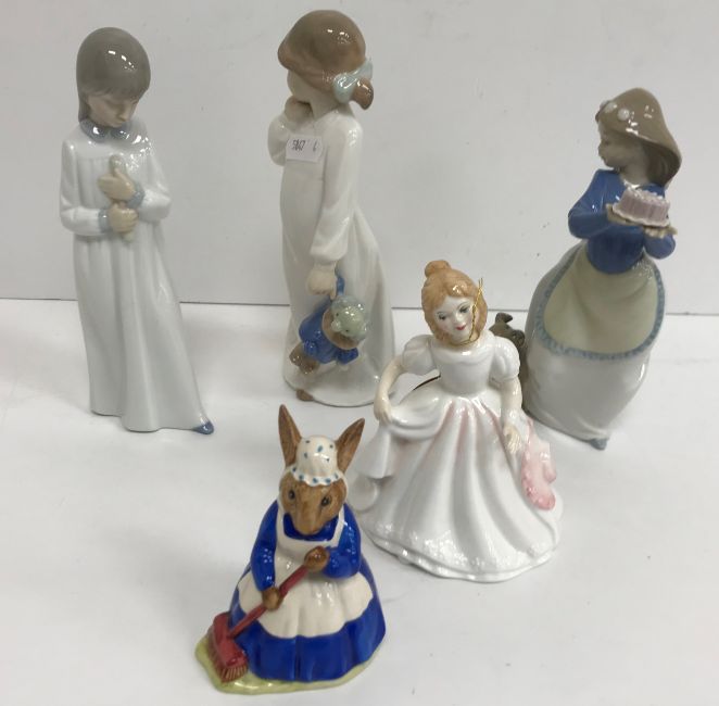 Two Royal Crown Derby figures including Collectors' Guild Exclusive "Catnip kitten" and Collectors' Guild "Puppy", a Royal Doulton figurine "Amanda" (HN2996), a Royal Doulton figure "Mrs. Bunnykins - Clean Sweep" (D86), Nao figure of "Young girl with puppy and cake", another as "Young girl in nightdress with clown doll" and another of "Young girl in nightdress" and a collection of three Royal Worcester figurines from The Pizzazz Collection, sculpted by Nigel Stevens including "Minnie", "Annie" and "Millie"