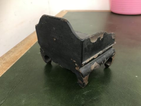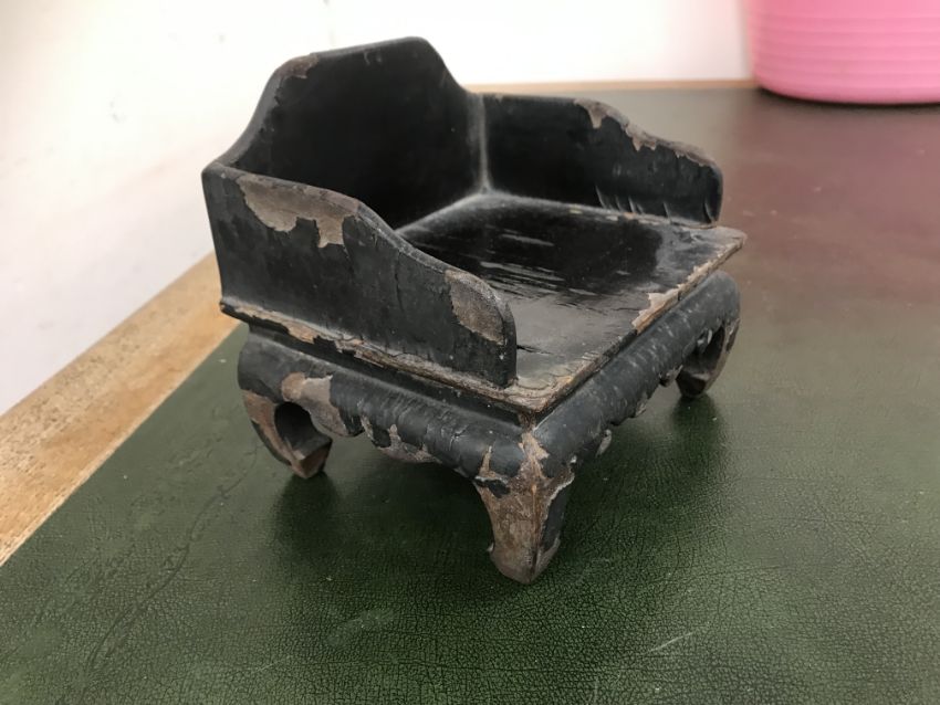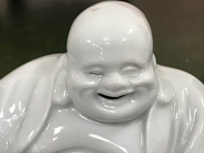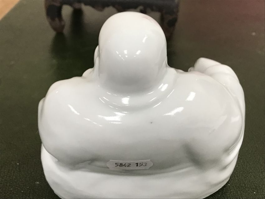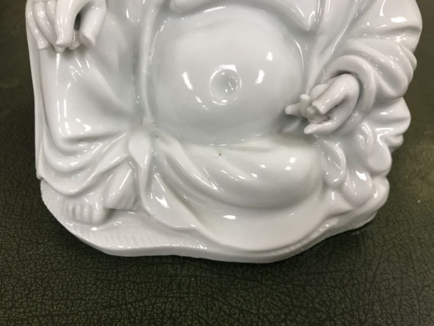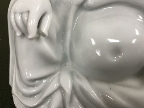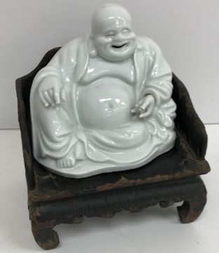An 19th Century Chinese blanc de chine figure of a smiling Buddha with open mouth and hollow base, seated on a lacquered throne chair, figure, 13 cm high, 20 cm high overall CONDITION REPORTS Hairline crack to bridge of nose, a firing fault and spot of discolouration to top of head. General wear and tear conducive to age and use. Chair - lacquer peeling though out, has had a couple of repairs with glue visable to base. See images for more details.