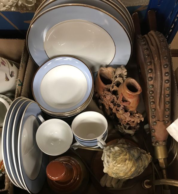 Five boxes of assorted modern household china to include Portmeirion "Botanic Garden" storage jars, etc, a Doulton pale blue and gilt decorated part dinner service, a Rosenthal "Und die Wunderlamp" decorative plate with Aladdin, Wedgwood vase and various Wedgwood trinket wares, a Royal Worcester figure "Spring morn", modelled by F G Doughty, a Denby "Arabesque" lidded serving dish, etc