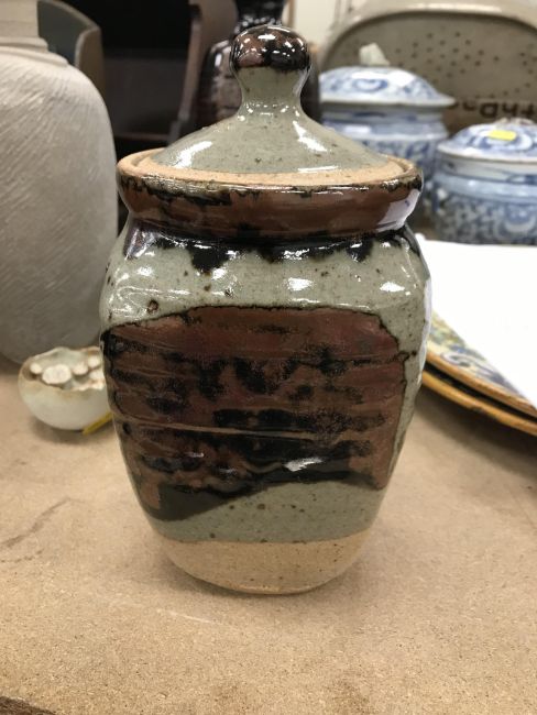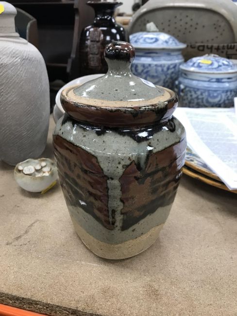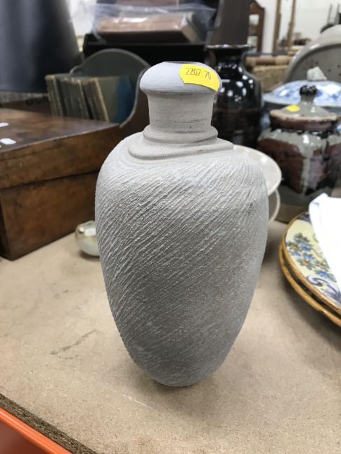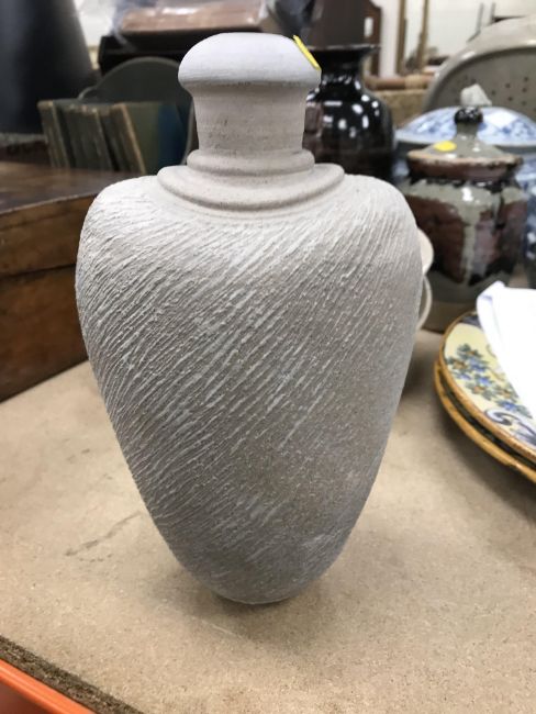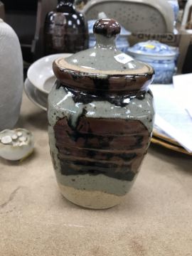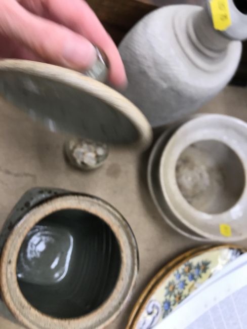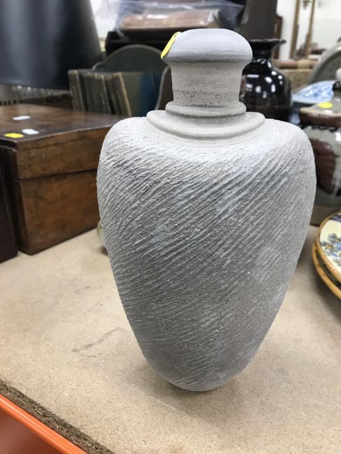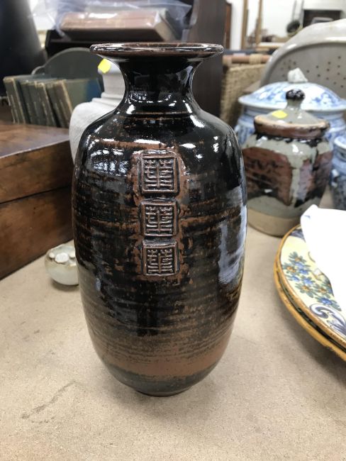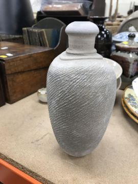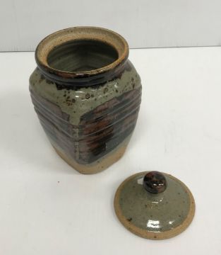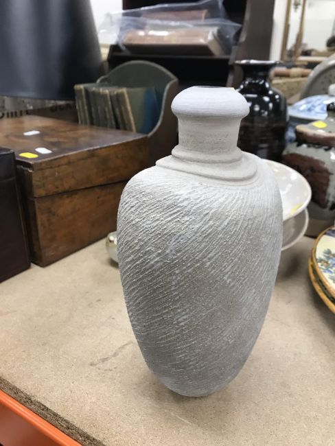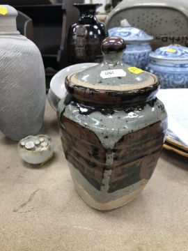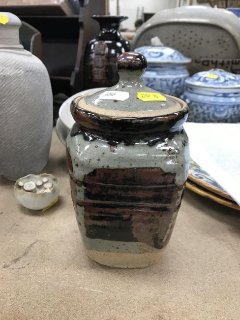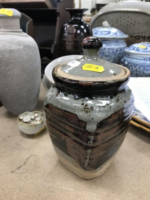 A collection of pottery to include a Danny Killick pottery lidded storage jar of square tapering form 19.5 cm high together with a further pottery flask with textured body inscribed "SJM" (possibly Sue Mundy) to back 23.5 cm high, a pottery bowl of twin pottery form indistinctly signed and dated 76 together with a Studio Pottery vase by Poh Chap Yeap (1927-2007) with brown grey glaze set with three Oriental character motifs signed to base 25 cm high and a small Studio Pottery ornament/bowl with internal decoration (ARR)