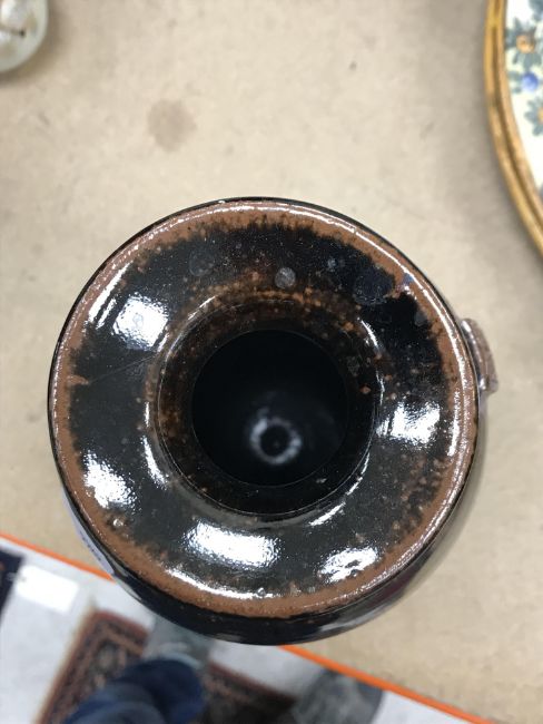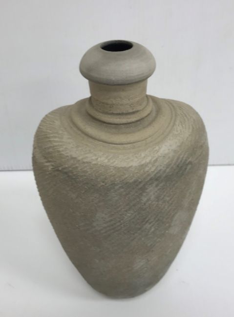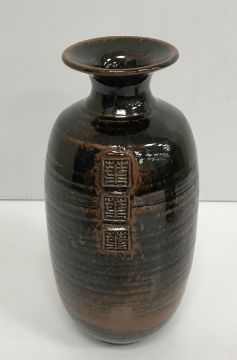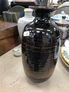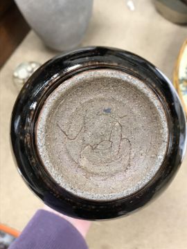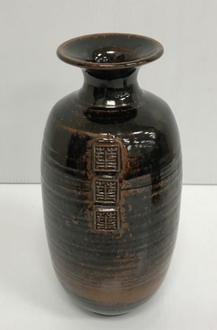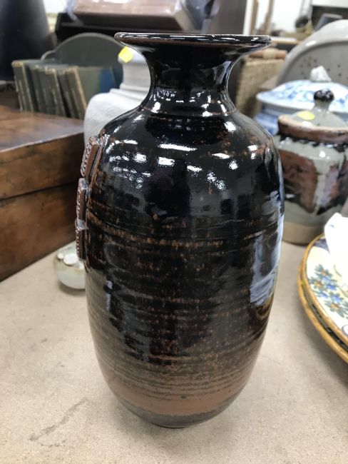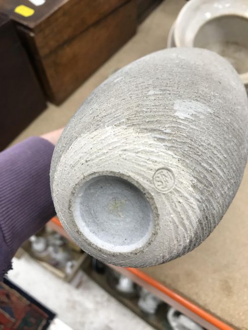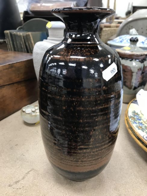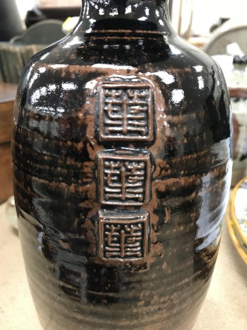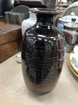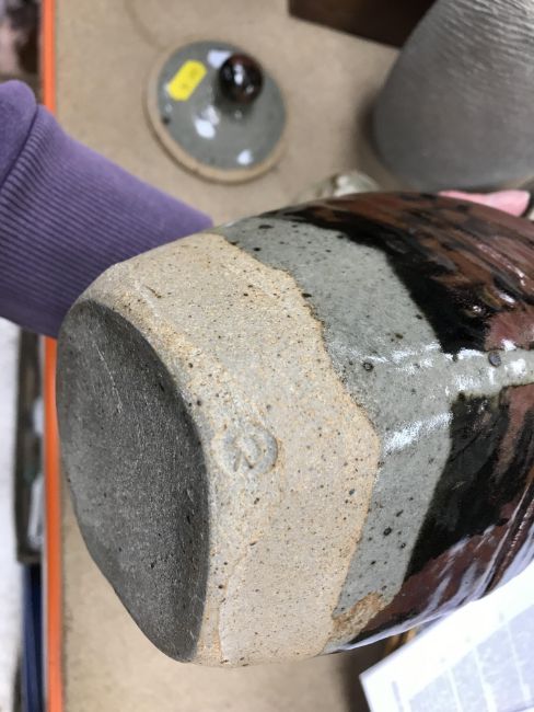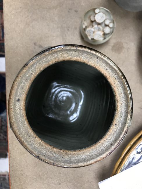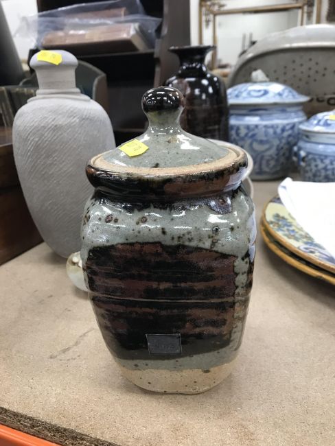 A collection of pottery to include a Danny Killick pottery lidded storage jar of square tapering form 19.5 cm high together with a further pottery flask with textured body inscribed "SJM" (possibly Sue Mundy) to back 23.5 cm high, a pottery bowl of twin pottery form indistinctly signed and dated 76 together with a Studio Pottery vase by Poh Chap Yeap (1927-2007) with brown grey glaze set with three Oriental character motifs signed to base 25 cm high and a small Studio Pottery ornament/bowl with internal decoration (ARR)