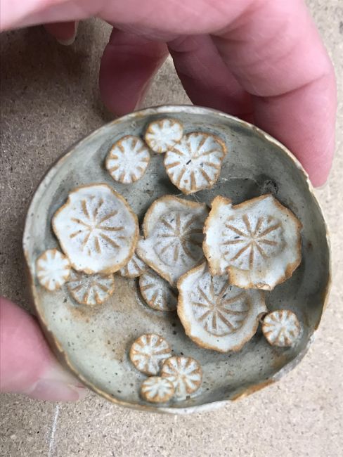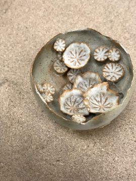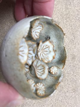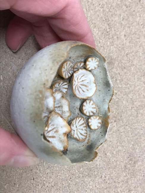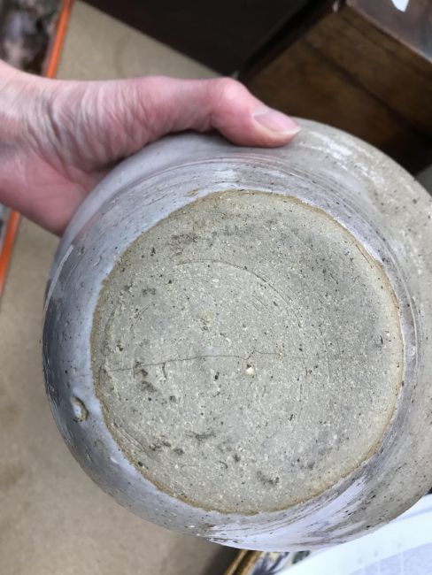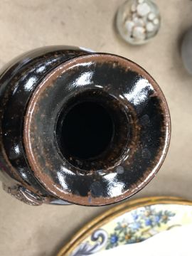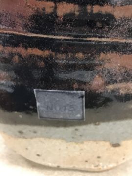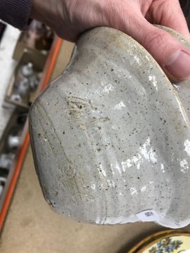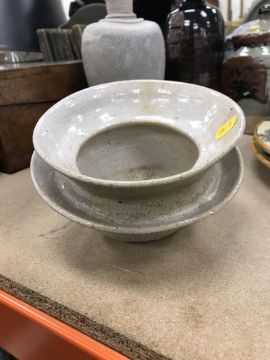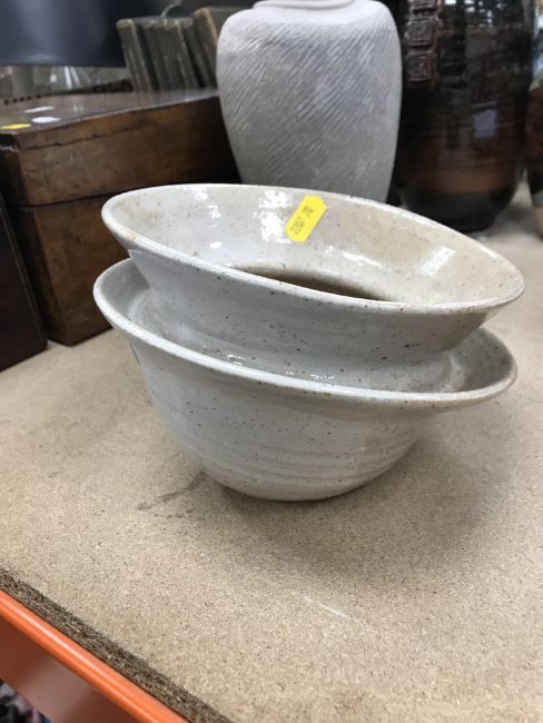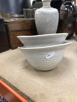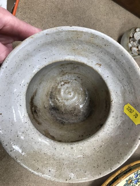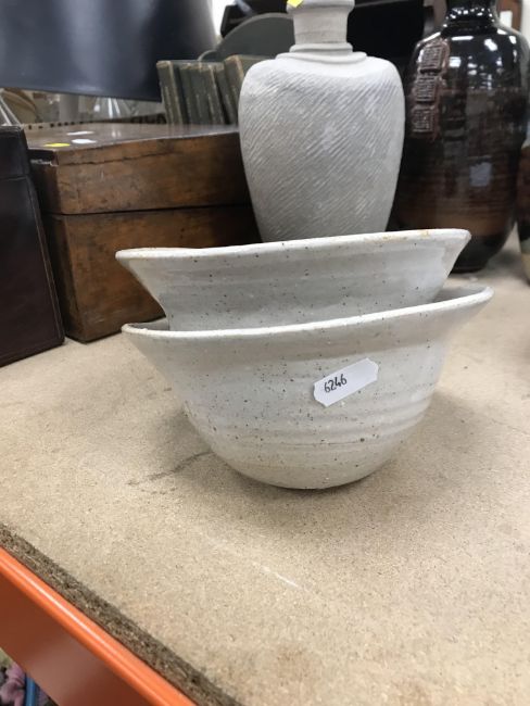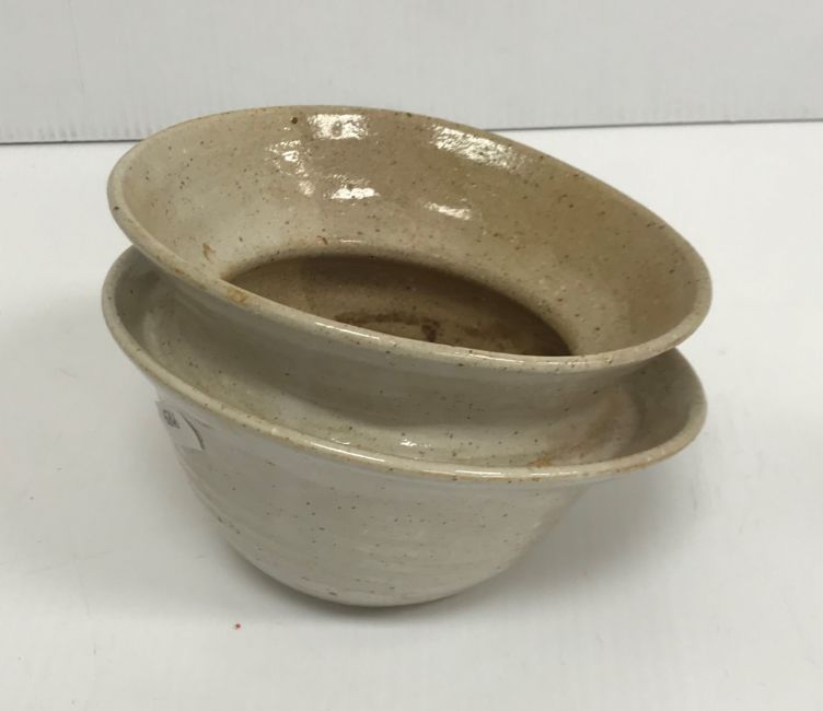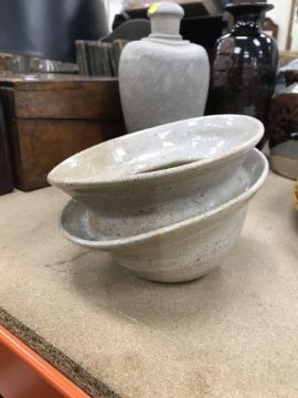 The pottery bowl of twin stacking form has a crack running through the base and the pottery bowl with internal decoration has several chips to the rim. Otherwise, all items have general wear and tear to include some minor firing faults including to the glaze