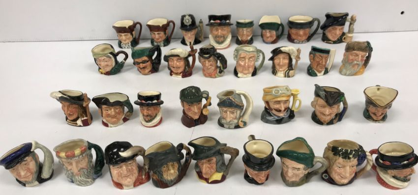 WITHDRAWN A collection of miniature Royal Doulton Toby jugs comprising "The London Bobby" (D6763), "Robin Hood" (D6541), "The Walrus and the Carpenter" (D6608), "Toby Weller", "Beefeater" (D6233), "Toby Philpott", "Mine Host" (D6513), "Dick Turpin", "Sariey Gamp" (D60645), "The Lawyer" (D6524), "Porthos" (D6516), "Athos" (D6508) and "Aramis" (D6508), "Beefeater", "The Sleuth" (D6639), "Don Quixote" (D6511), "Old Charley" (x 2), "Tam o'Shanter" (D6640), "Dick Turpin" (D6542), "The Mikado" (D6525), "Veteran Motorist" (D6641), "Robinson Crusoe" (D6546), "Pied Piper" (D6514), "Captain Haab" (D6522), "Neptune" (D6555), "Gone Away" (D6545), "John Peel", "Beefeater", "Bacchus" (D6521), "Rip Van Winkle" (D6517), "Auld Mac" (D6253) and "Mr Pickwick" (33)