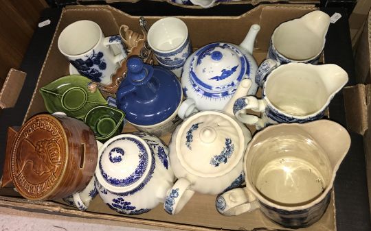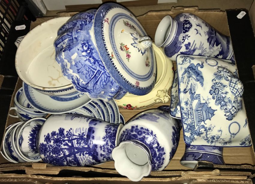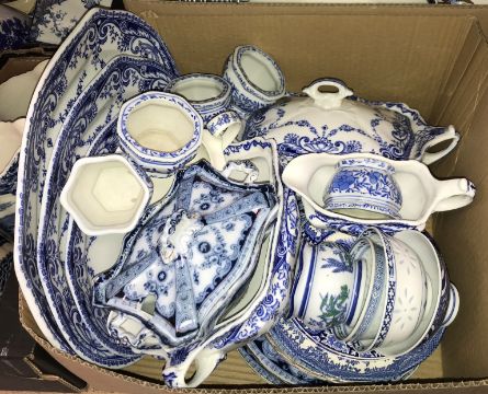 WITHDRAWN Four boxes of assorted, mainly blue and white decorative chinawares to include dinner plates, tureens, serving platters, jugs etc. together with two boxes of sundry china and glass ornaments, a box containing assorted sundry items to include a quantity of blue glass sugar bowls, eye baths, vases, etc and a box of china chicken "egg" baskets, etc. (8 boxes total)