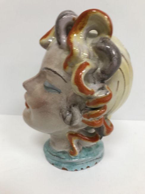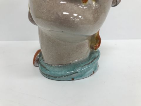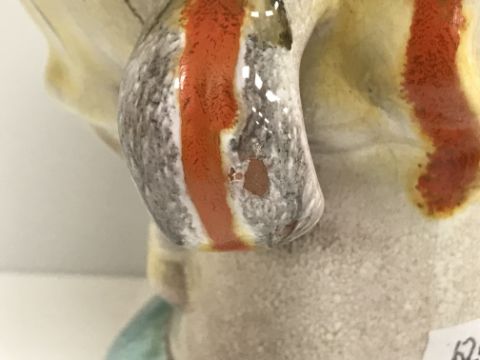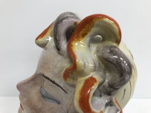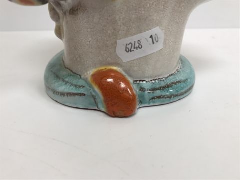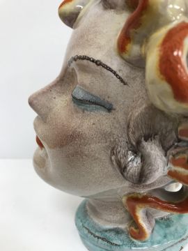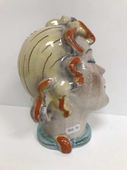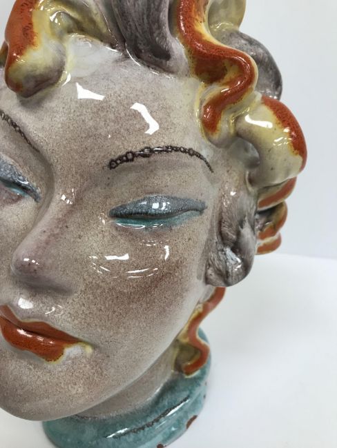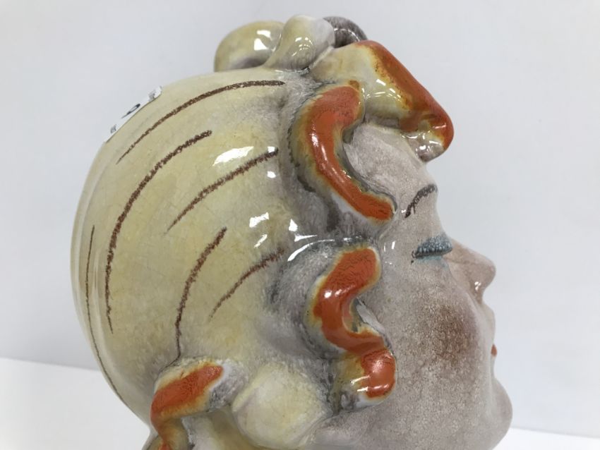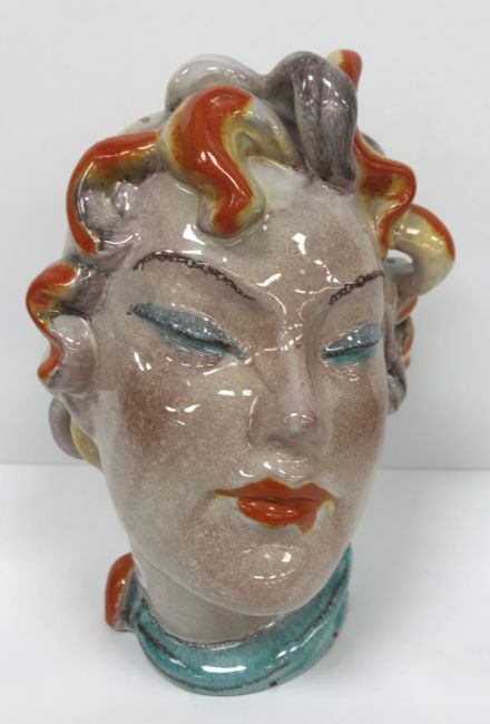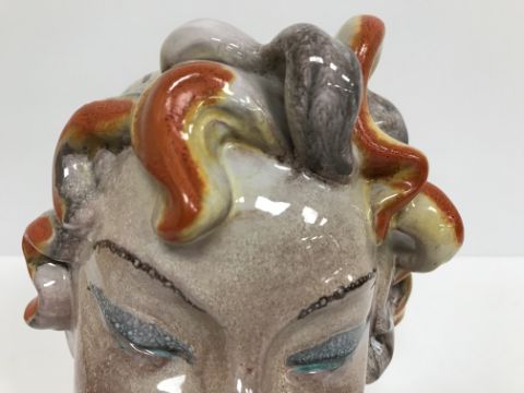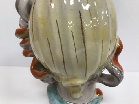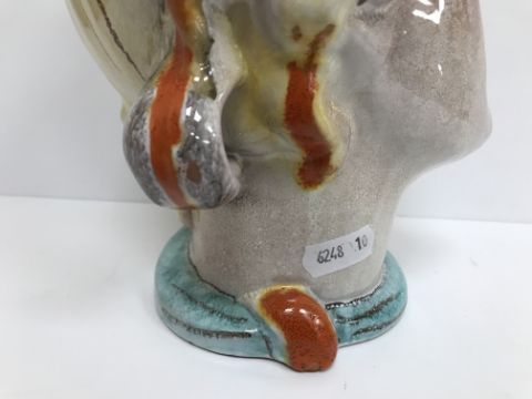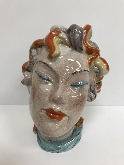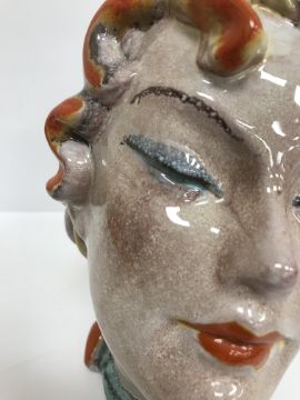 A Continental glazed pottery figure of a "Lady's head" in the Art Deco Goldscheider manner, No'd. 475 to base, 20 cm high CONDITION REPORTS Has crazing all over. Some chipping to the base although some appears to have been done during manufacture. Surface scratches. There is an area of glaze missing from her back left hand curl. Otherwise general wear and tear conducive with age and use, to include in need of a clean. See images for more detail.