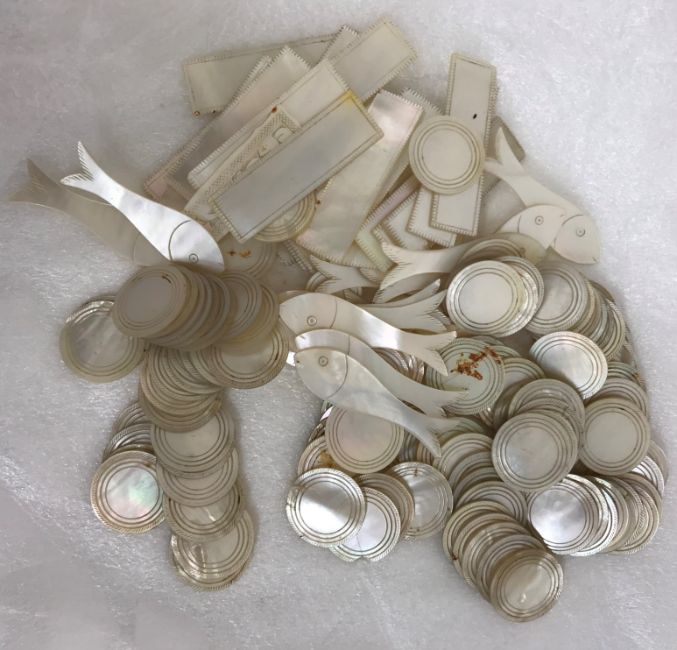 A collection of mother of pearl gaming tokens comprising 18 fish tokens, 99 circular tokens and 22 rectangular examples, all of plain design