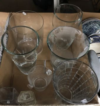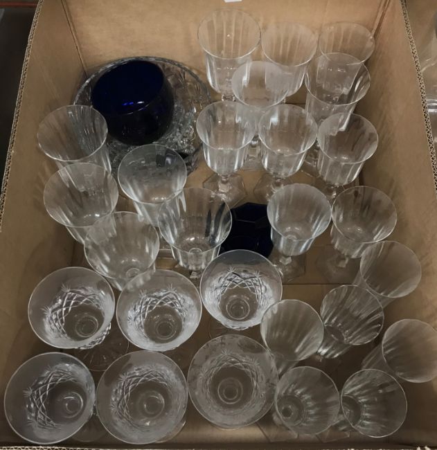 Three boxes of assorted glassware to include various vases, wine glasses etc.
