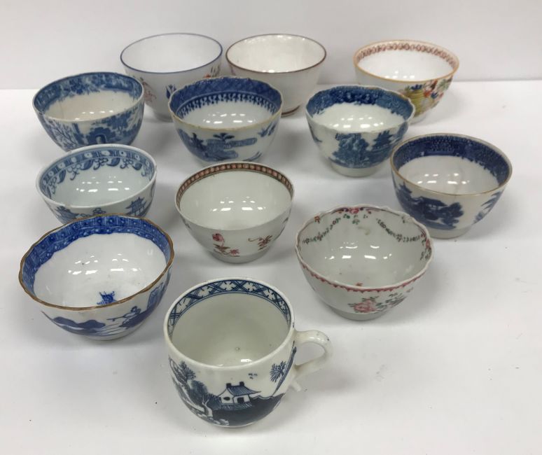 A collection of Oriental and English mainly blue and white tea bowls and cups to include a Lowestoft example (12)