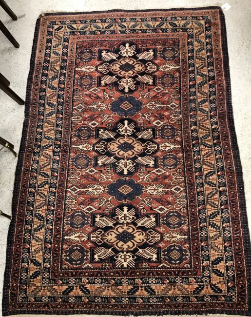 A vintage Caucasian rug, the central panel set with repeating stylised flower head medallions on a terracotta ground, within a stepped terracotta, blue and beige geometric and stylised foliate border, approx 219 cm x 145 cm