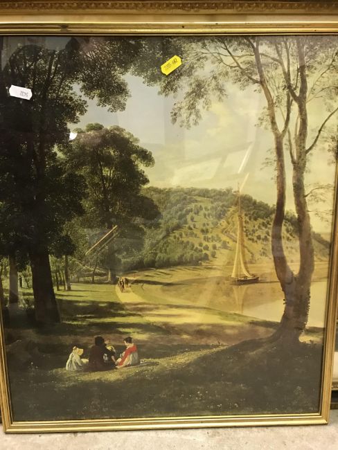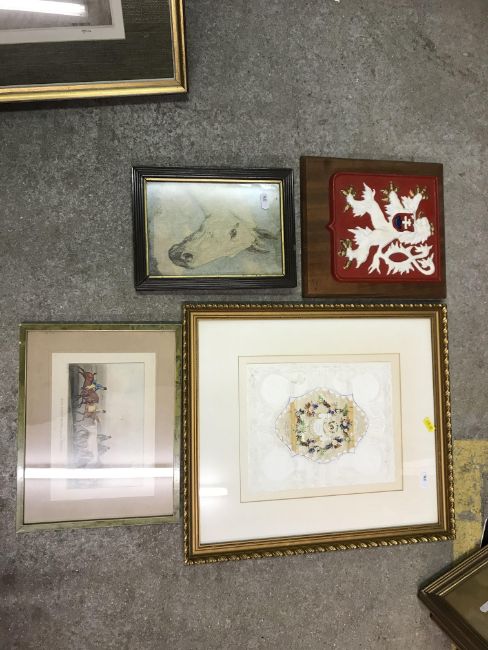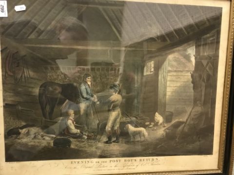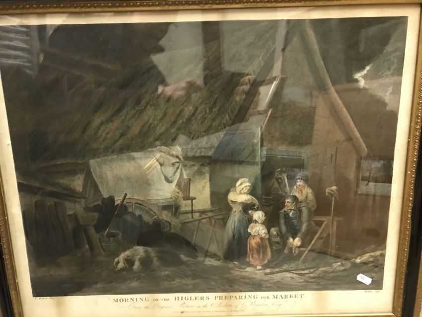 AFTER GEORGE MORLAND "Evening or the post boy's return" coloured engraving by D Orme, published 1796 together with another "Morning or the higlers preparing for market" together with three various prints, a cast iron and painted plaque depicting a lion rampant bearing label verso "Presented to Sally and Patrick Parks at the celebration of 55 years of free Czechoslovakia 1918-1973", a silkwork and pierced paper valentine inscribed "May Cupid thee to pity move for pity melts the mind to love" and a Balinese study of figures by riverside amongst foliage signed "L Sufawan" (eight)