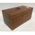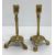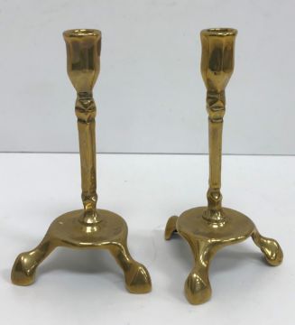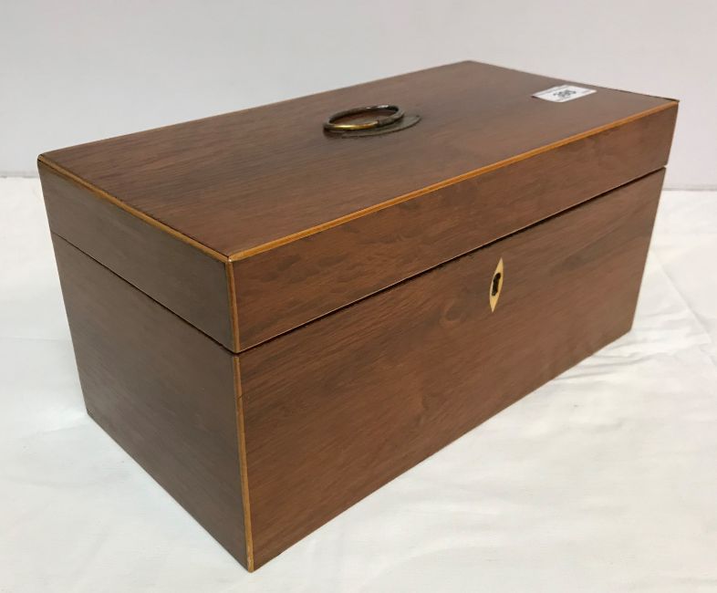 A 19th Century Australian buloke veneered tea caddy of plain rectangular form, satinwood strung, opening to reveal a central recess flanked by two lidded compartments, 30.5 cm wide x 15.3 cm deep x 15 cm high, together with a pair of 18th Century brass candlesticks on tripod bases, 17 cm high