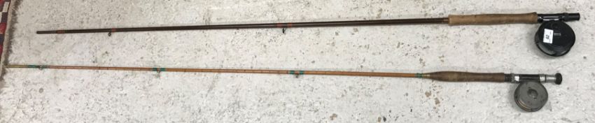 A Hardy Brothers "The Uniqua" 27/8" fly reel, housed on a split cane two piece fly rod, together with a Keith Sykes Nymphlyte No. 7 rod with Leeda rim fly reel